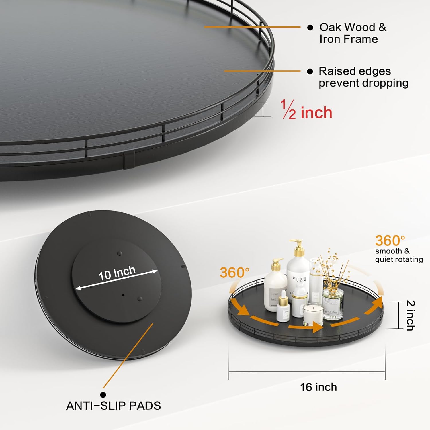 - ๐ง๐ต๐ผ๐๐ด๐ต๐๐ณ๐๐น ๐๐ฒ๐๐ถ๐ด๐ป: The turntable tray features a smooth and silent 360ยฐrotation; Bottom slip-resistant pads for stability and protect your countertop from scratches; Raised edges on each organizer tray to keep items from falling out; Easy to use, no installation required