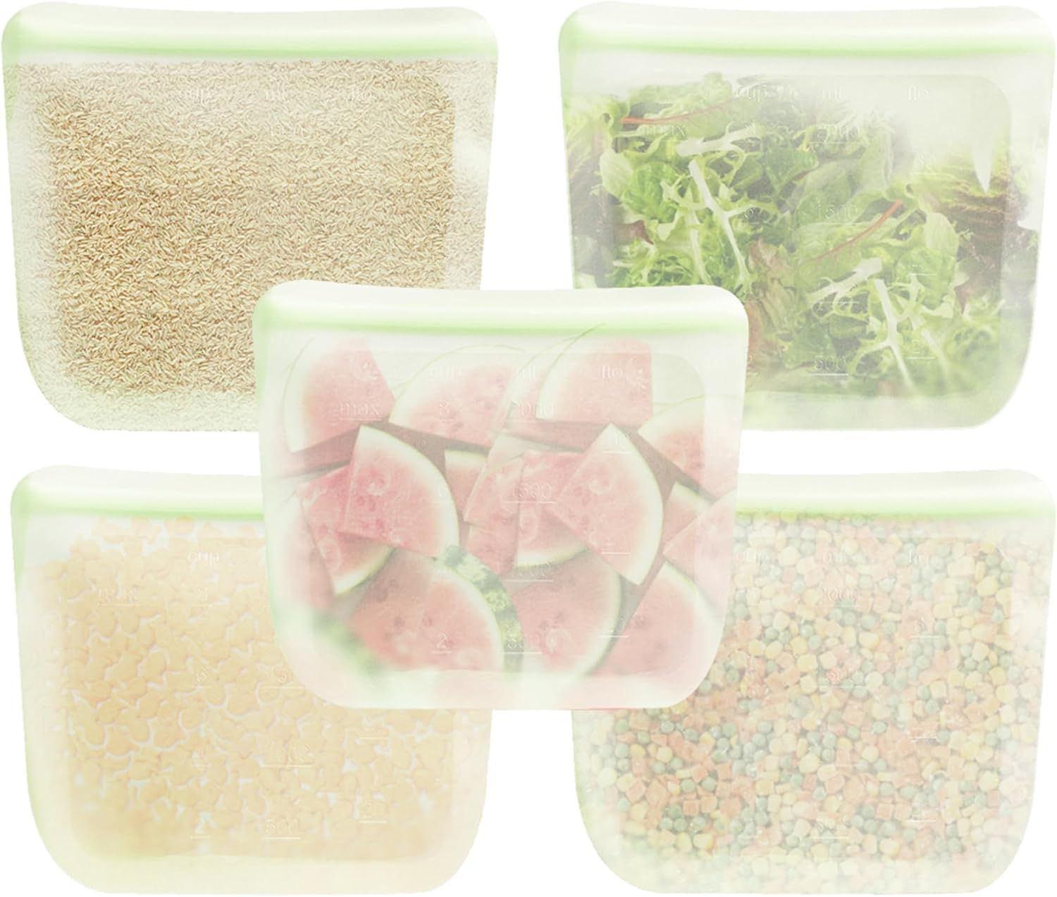 purifyou Set of 5 Reusable Silicone Storage Snack Bags 6oz / 16oz / 32oz / 64oz Self-Seal Food Storage Container for Fruits, Vegetables, Sandwiches, Dishwasher Safe & Leak-free (LimeCream, 646oz)