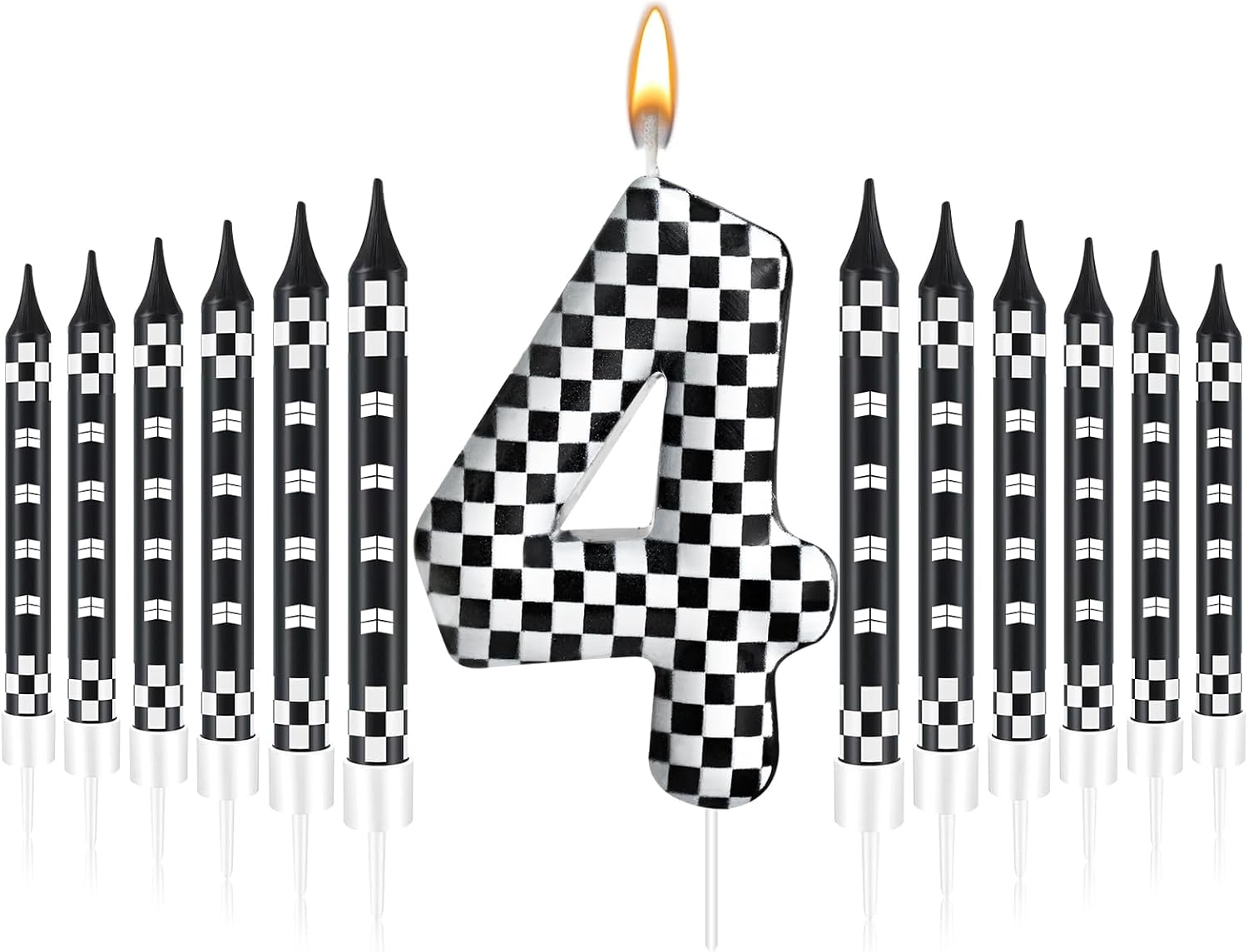- The Package Includes: You will receive 12 black and white track car themed birthday candles and 1 number 4 black and white checkered candle, Sufficient quantity for birthday cake decoration or party celebration and daily use, note: the candle will slowly melt as it burns, and it is recommended not to leave it on the cake for more than two minutes