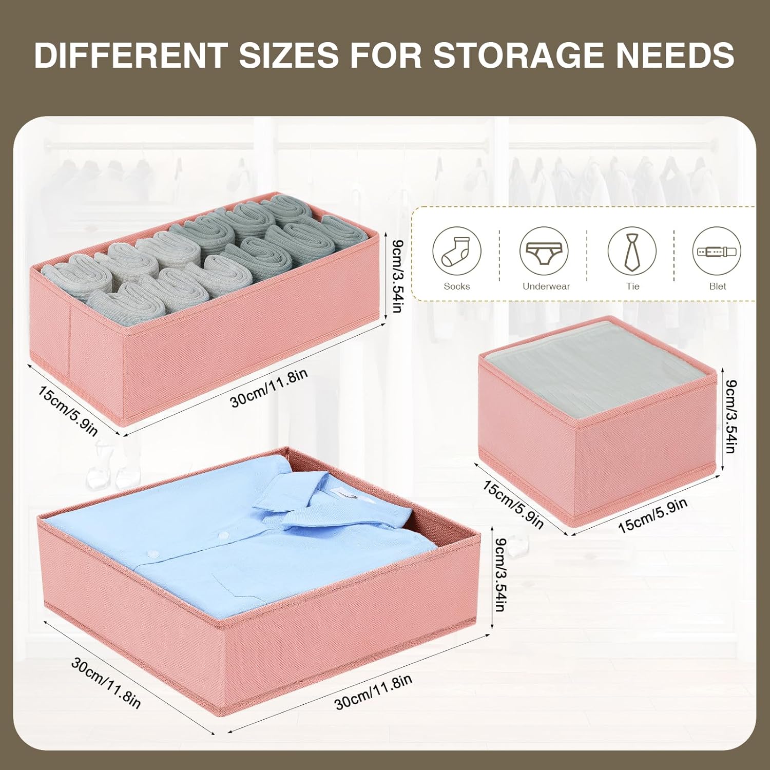 - Material and Size of Drawer Organizers: Made from non-woven fabric which is breathable and long lasting appeal. Fabric dresser drawer organizers measurements are: 11.8*11.8*3.54", 11.8*5.9*3.54", 5.9*5.9*3.54"