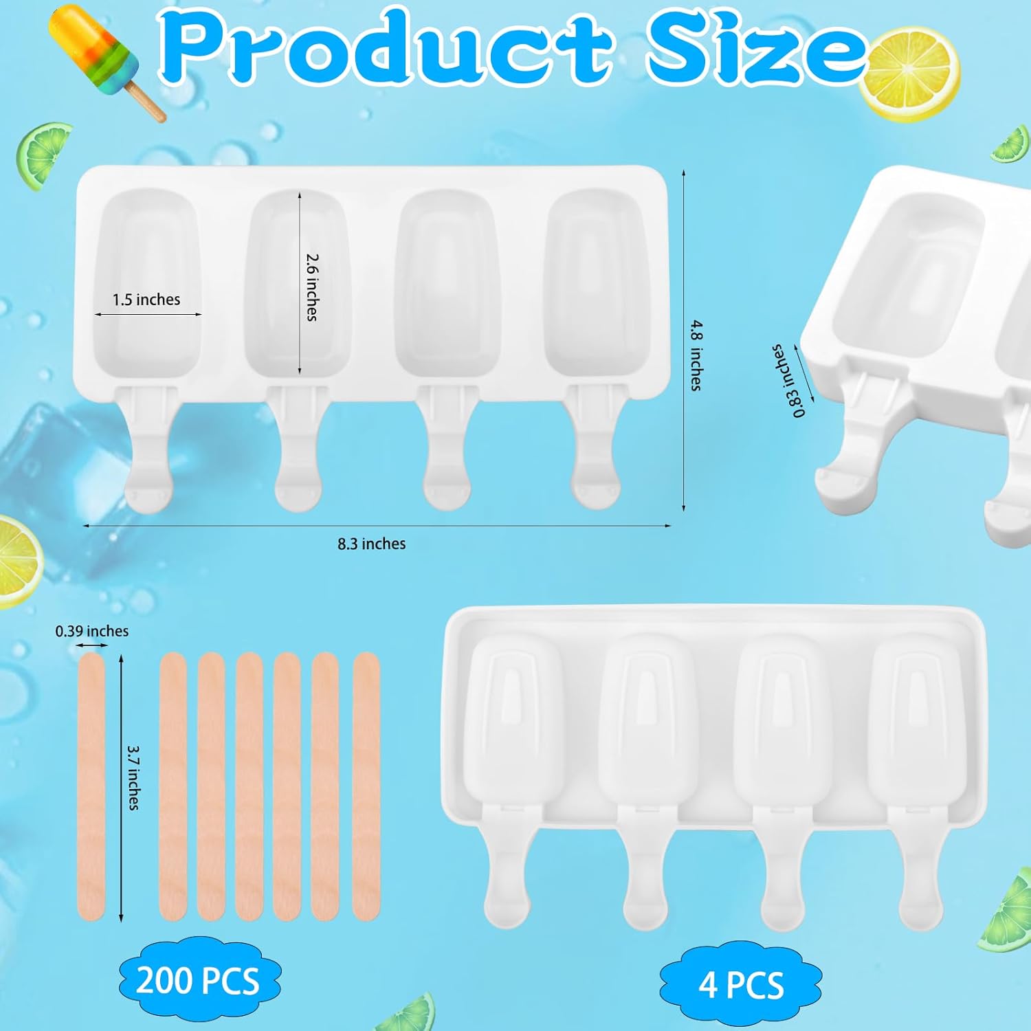 - Product Size: each 4 cavities ice cream mold measures about 8.3 x 4.8 x 0.83 inches in total, has a slot of about 2.6 x 1.5 inches (slightly less than half the size of a phone), and wooden sticks is 3.7 x 0.39 inches, just the right size to hold enough mixture to make a bite-sized frozen food, making 16 ice cream at a time, which is convenient and time-saving