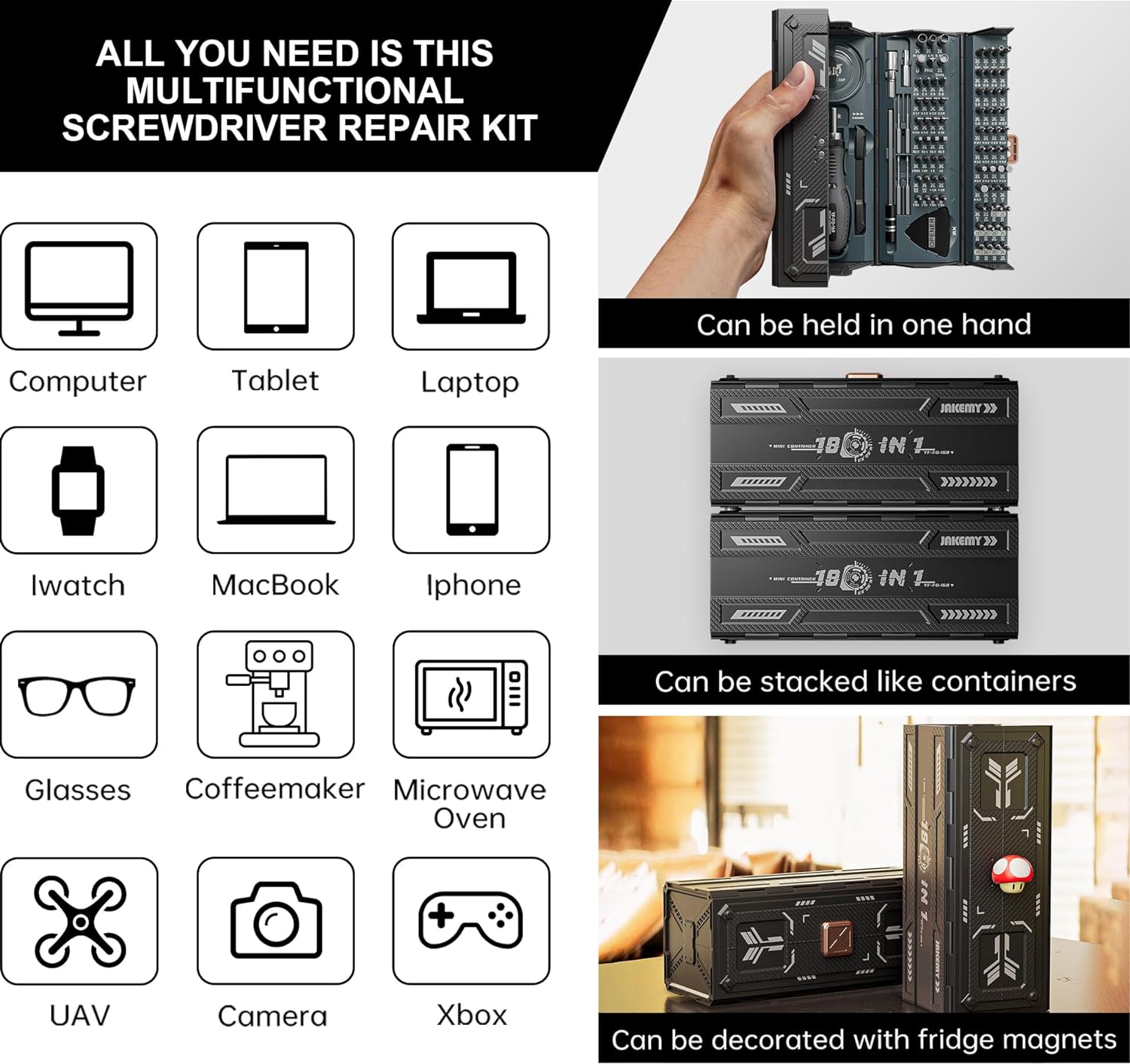 - 【 Multi-Purpose Screwdriver Kit 】This multi-bit screw drivers kit comes with most needed magnetic screwdriver bits for electronics repair, home repair or DIY programs, suitable for laptop, pc, tablet, iPad, MacBook, iPhone, phones, switch, Xbox, ps5, console, camera, RC car, watch, glasses, drone, toy, mold disassembly, coffee maker, screen removal and other small items.