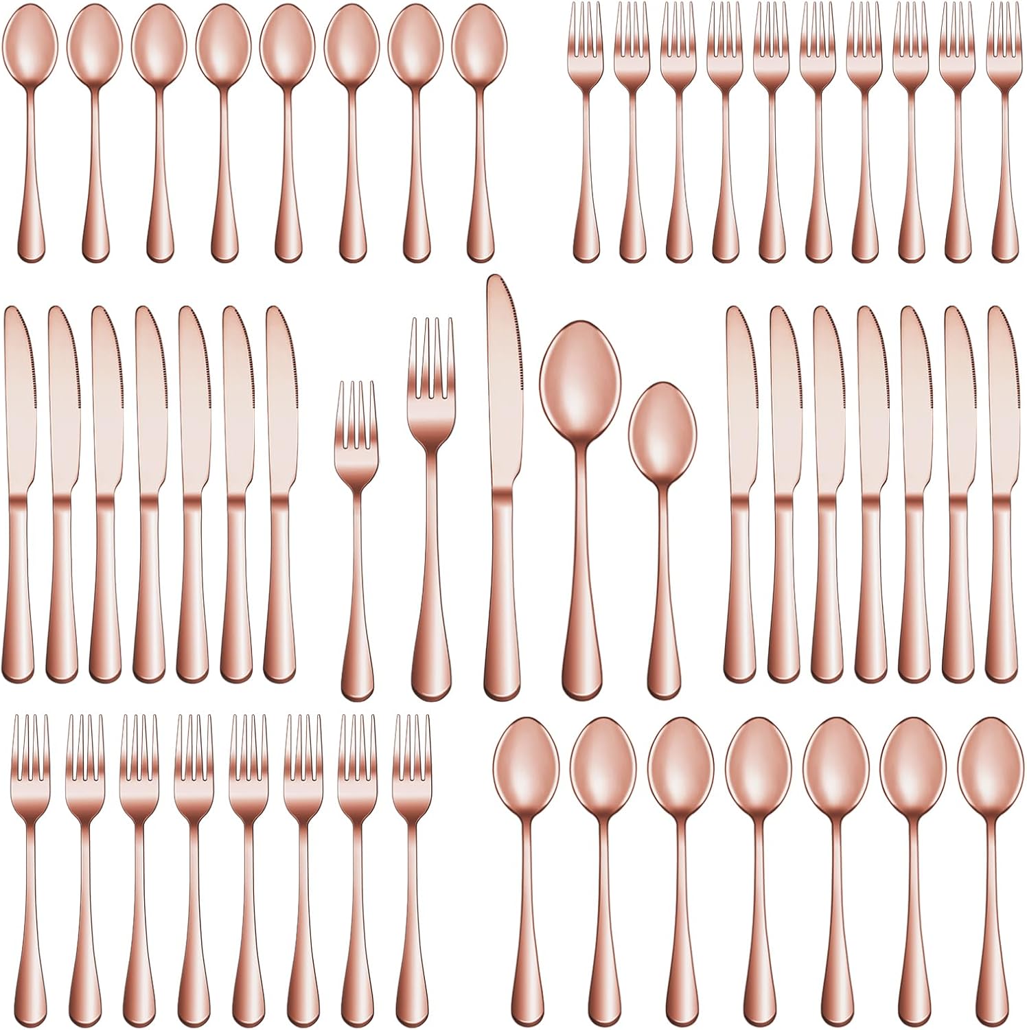 - 40 PCS ROSE GOLD SILVERWARE SET SERVICE FOR 8: This rose gold silverware set comes with 8 Dinner Forks, 8 Dinner Spoons, 8 Dinner Knife, 8 Salad/Dessert Fork and 8 Dessert/Tea Spoons, essential for families or restaurants. The set is also an irreplaceable dining tool whether it is for daily use or for preparing dinners or parties.