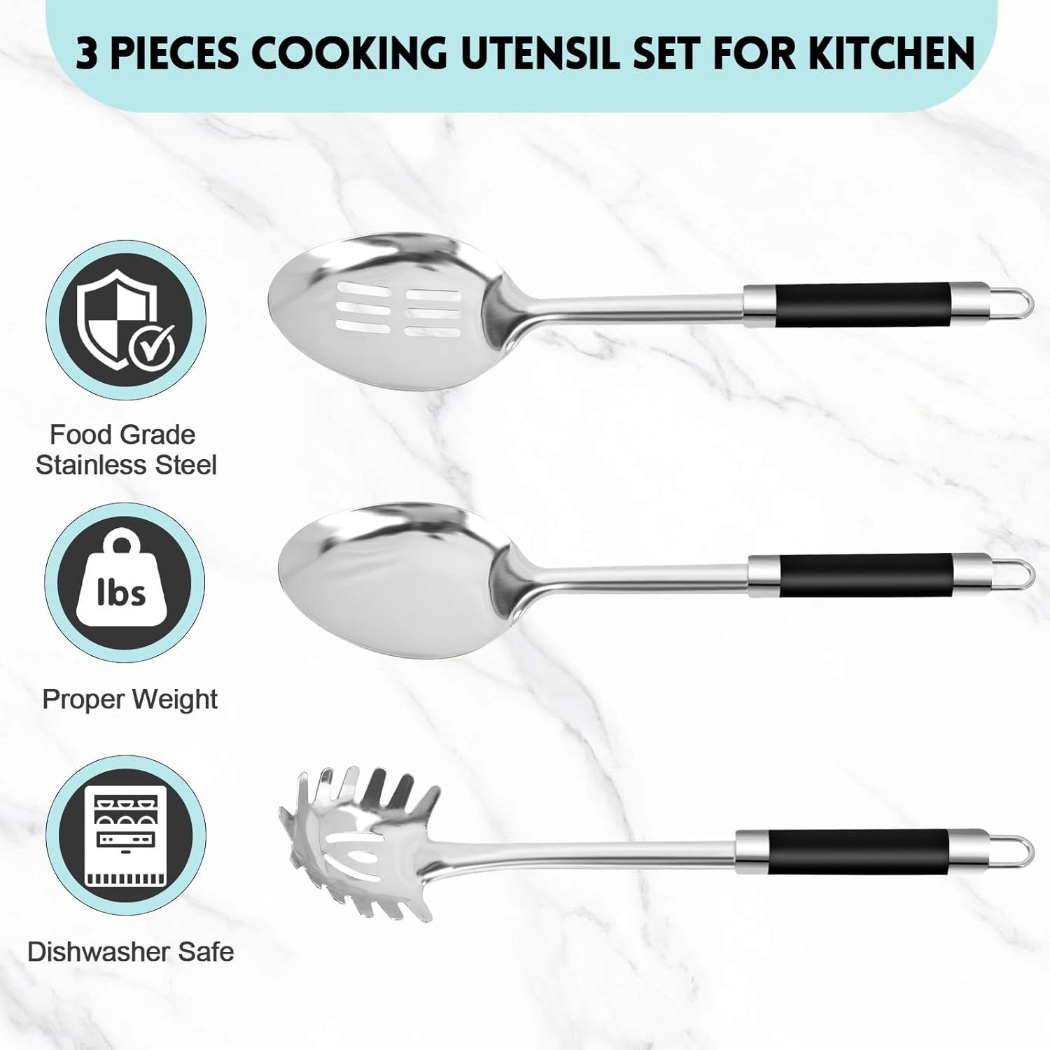 - Purpose: A set of 3 stainless steel large serving spoons (solid spoon, slotted spoon, spaghetti spoon), which is an excellent performer in busy restaurants, school cafeterias, hotels, family-style restaurants, and food service establishments.