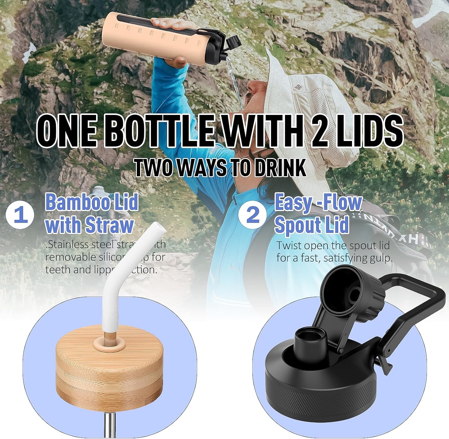 - DUAL-LID WATER BOTTLE - NOLOGLAZIC glass bottle features unique dual-lid design offers you more choices. Use the eco-friendly bamboo straw lid for worry-free sipping during office hours or while gaming or working. When hiking, camping, or traveling, switch to the 100% leak-proof easy-flow spout lid. Simply twist open the spout lid for a fast, satisfying gulp.