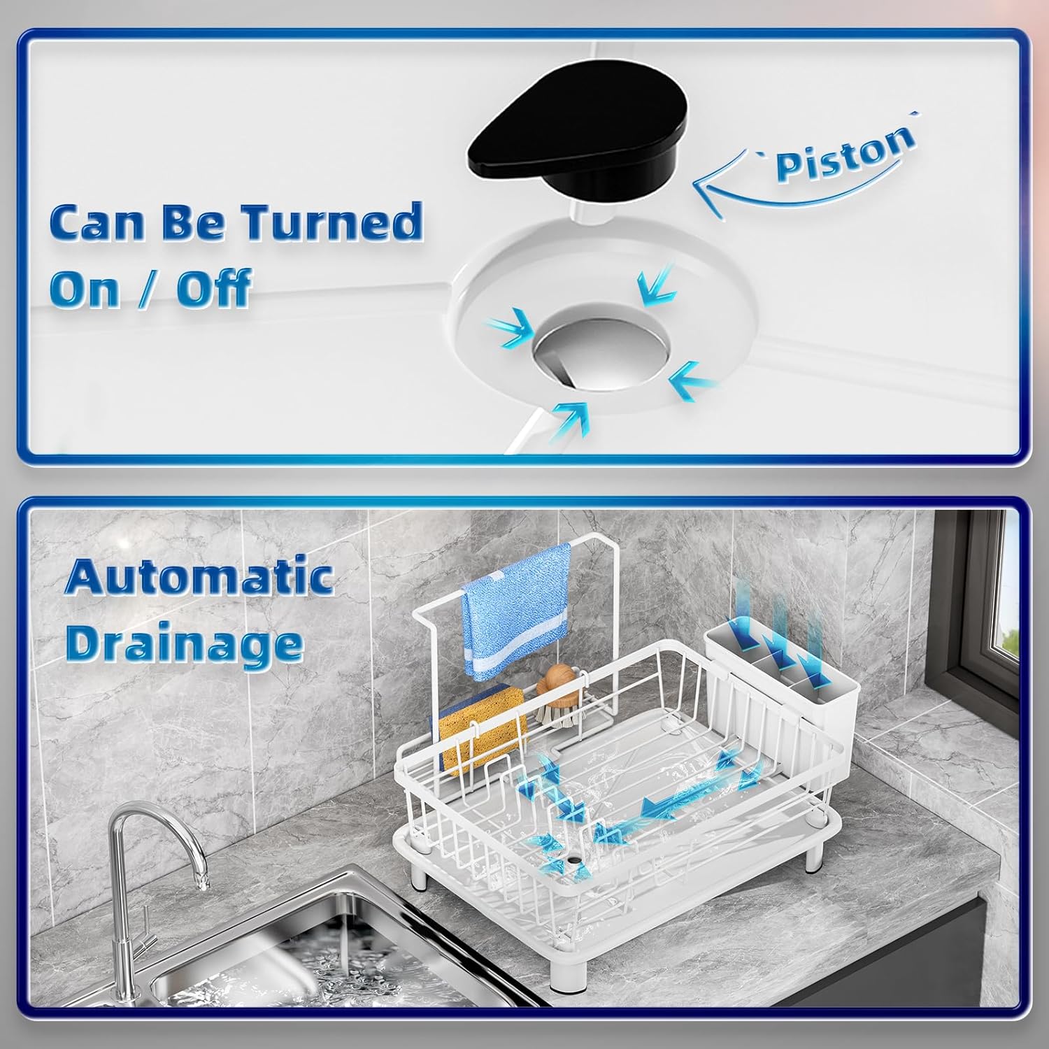 - EFFICIENT DRAINAGE SYSTEM: GAOKASE cutlery drying rack is equipped with an hourglass-shaped drain tray, built-in water channel and adjustable telescopic cutlery drainer, which can quickly drain water into the sink. Note: The piston needs to be opened before draining.