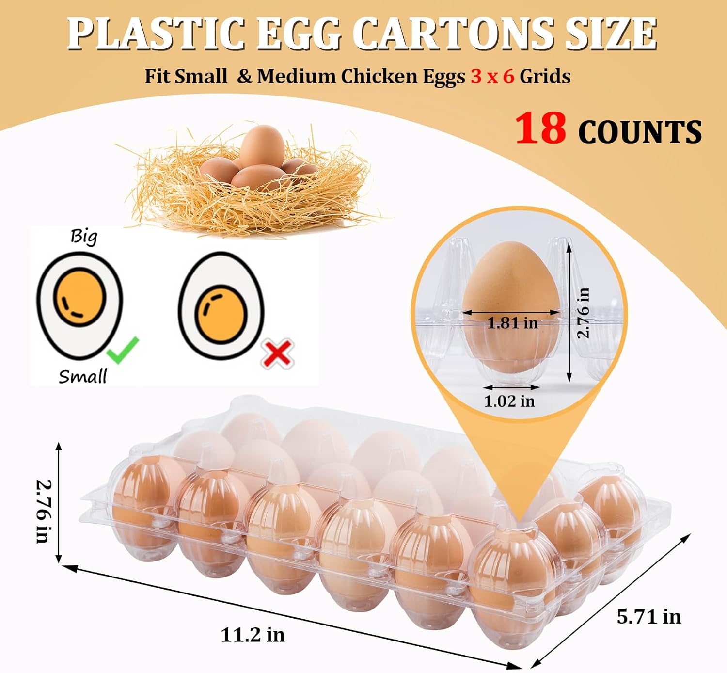 - MEDIUM EGG HOLDER: Each plastic egg carton measures approximately 11.2 x 5.71 x 2.76 inches, providing ample space for up to 18 eggs per carton. This medium-sized egg trays allows you to efficiently display regular hen eggs in farmers' markets, grocery stores, and beyond.