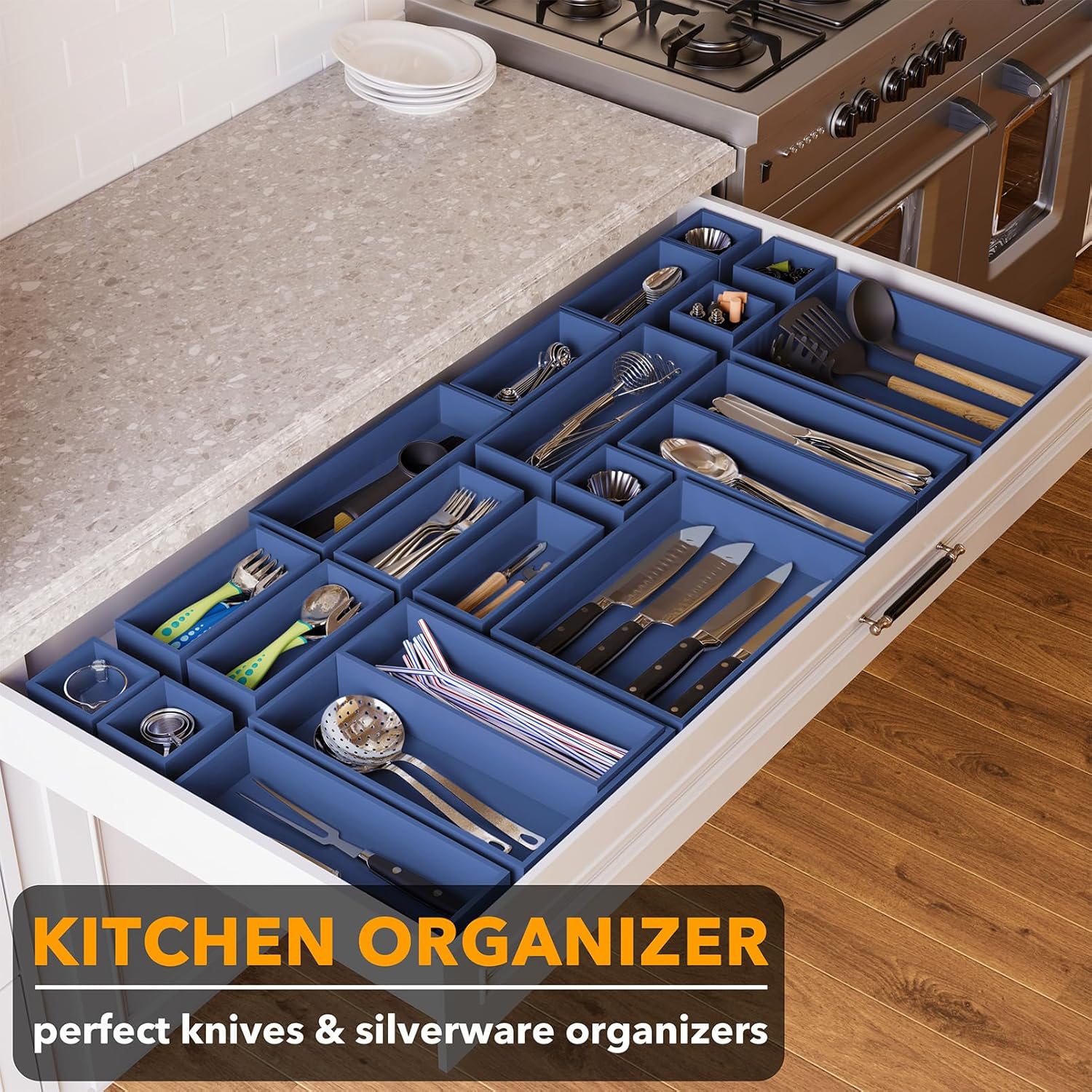 SpaceAid 21-Piece Bamboo Drawer Organizer Storage Boxes Set, Wood Tray Junk Drawer Organizers Multi-Use Divider Bins for Kitchen, Bathroom, Office Desk and Makeup Organization (21 Pack, Navy Blue)