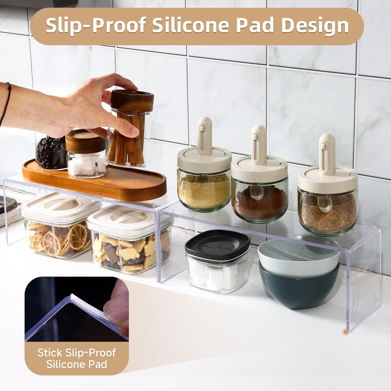 - 【Slip-proof design】Our acrylic shelf organizer comes with a pack of slip-proof silicone foot pads, stick the slip-proof silicone feet mats on the cabinet shelves to effectively slip-proof moving when you place spices, dishes, small appliances, soda cans and bottles, mugs/cups.