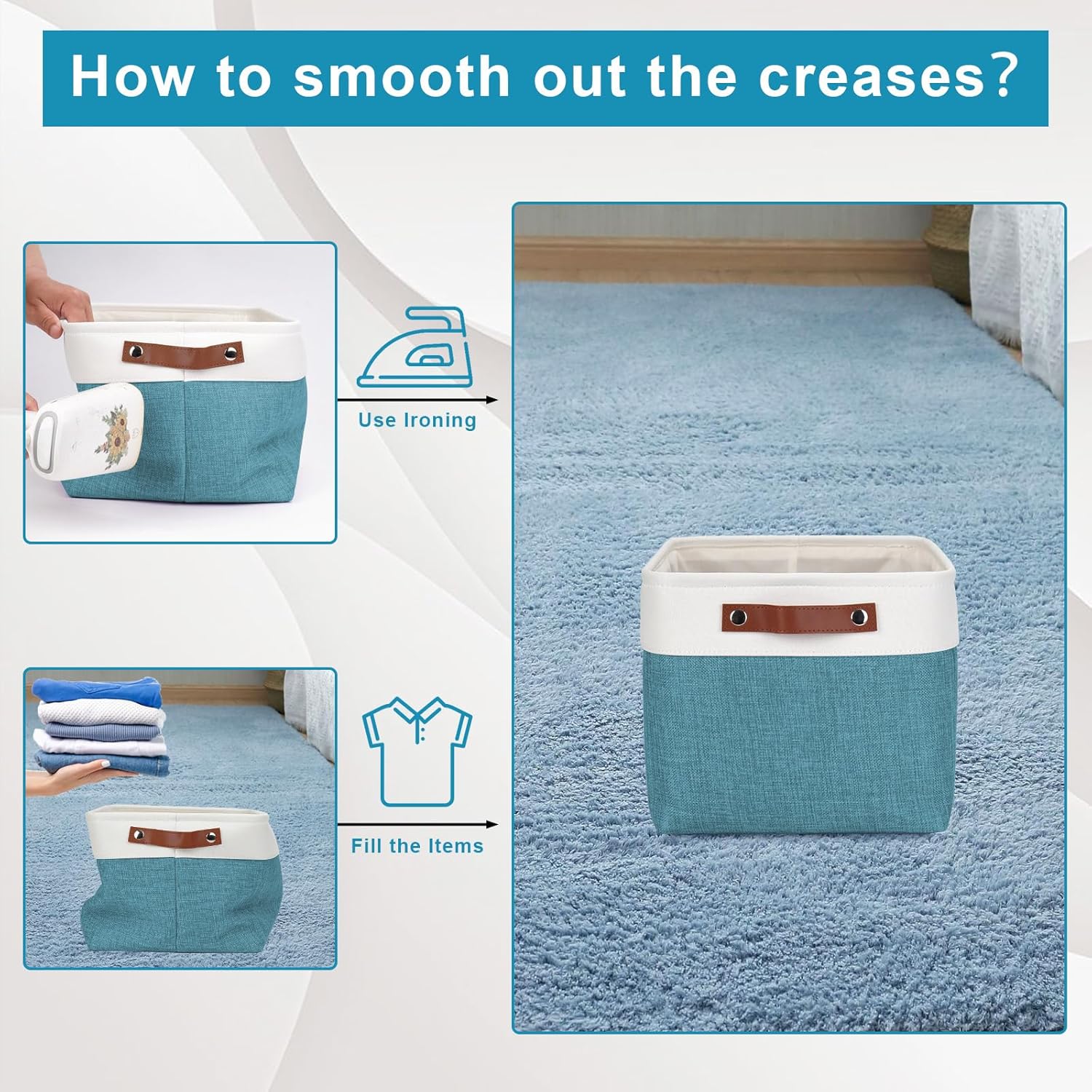 - 【Maintenance & Care Tip】 - Collapsible design for space saving. Our foldable baskets comes in a compression packing which may result in wrinkled storage bin during the long transit. Get rid of the wrinkles by either stuffing the fabric storage bins with blankets and pillows for a few days or steam iron them at low-heat setting. The organization baskets are easy to clean, you can dust the basket with a soft cloth with light soapy water when needed. Not recommended to machine wash.