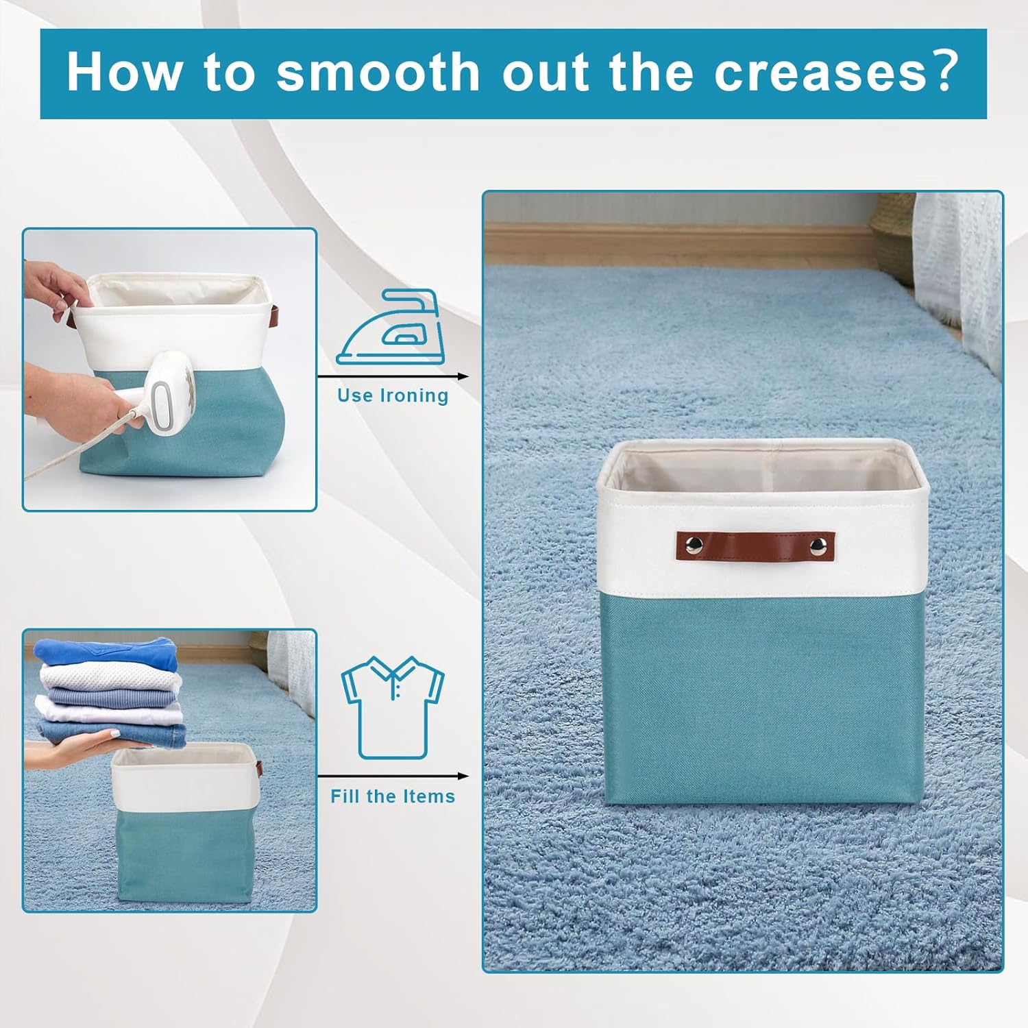 - 【Maintenance & Care Tip】 - Collapsible design for space saving. Our foldable baskets comes in a compression packing which may result in wrinkled storage bin during the long transit. Get rid of the wrinkles by either stuffing the fabric storage bins with blankets and pillows for a few days or steam iron them at low-heat setting. The organization baskets are easy to clean, you can dust the basket with a soft cloth with light soapy water when needed. Not recommended to machine wash.