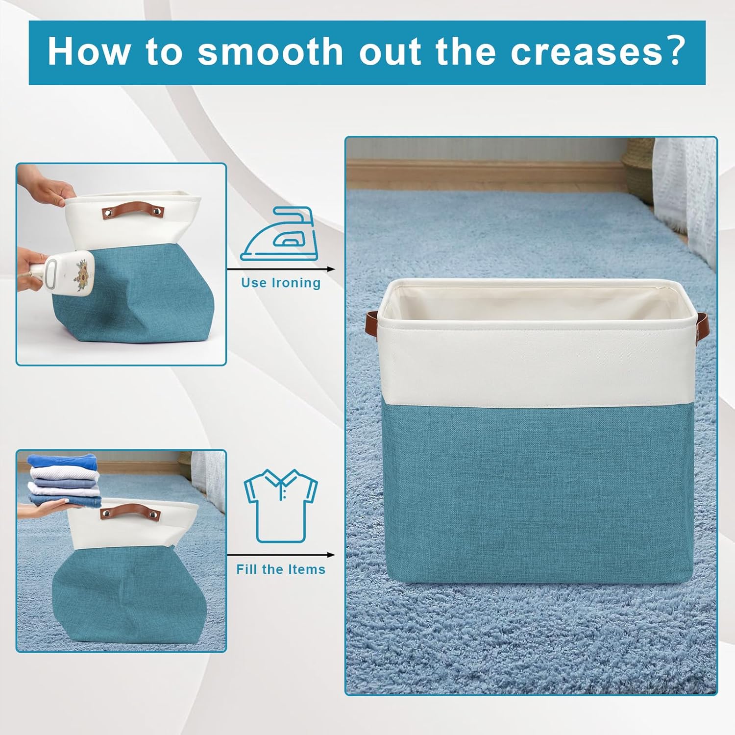 - 【Maintenance & Care Tip】 - Collapsible design for space saving. Our foldable baskets comes in a compression packing which may result in wrinkled storage bin during the long transit. Get rid of the wrinkles by either stuffing the fabric storage bins with blankets and pillows for a few days or steam iron them at low-heat setting. The organization baskets are easy to clean, you can dust the basket with a soft cloth with light soapy water when needed.