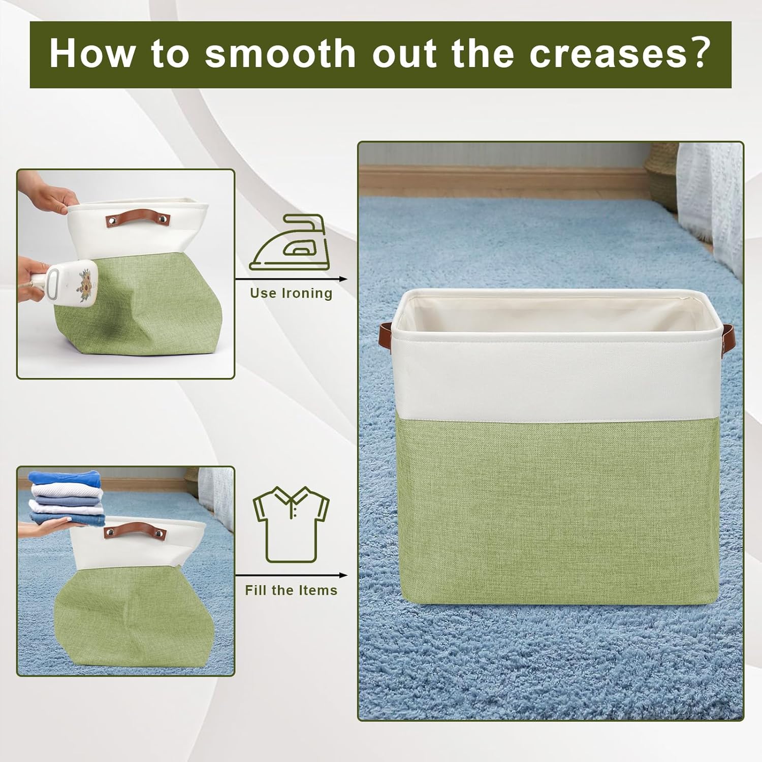 - 【Maintenance & Care Tip】 - Collapsible design for space saving. Our foldable baskets comes in a compression packing which may result in wrinkled storage bin during the long transit. Get rid of the wrinkles by either stuffing the fabric storage bins with blankets and pillows for a few days or steam iron them at low-heat setting. The organization baskets are easy to clean, you can dust the basket with a soft cloth with light soapy water when needed.