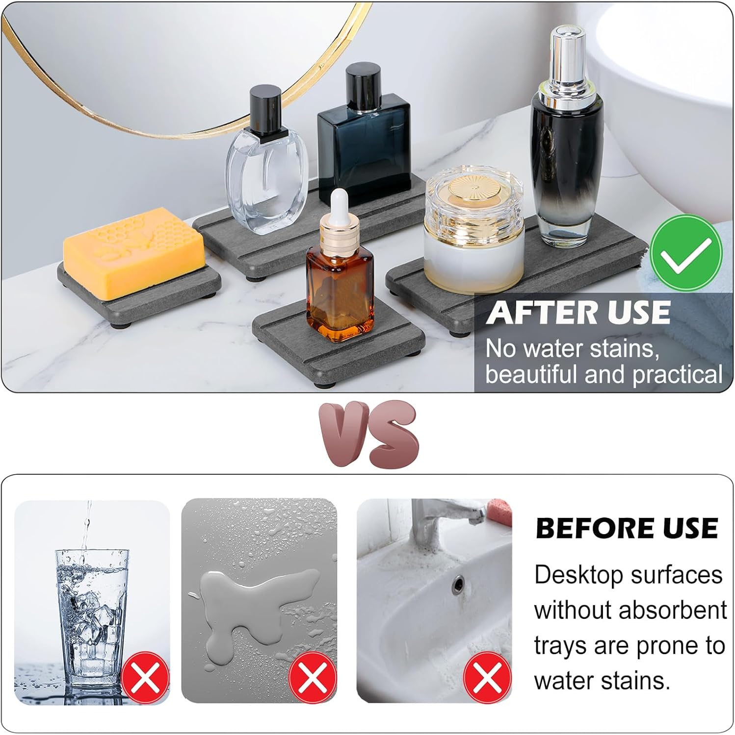 - More Anti Slip and Ventilated --- The silicone footpads boost the slip-resistance of absorbent stone coasters while keeping them out of the bathroom vanity. This design improves the contact surface between diatomaceous earth coasters and air, accelerates the evaporation of water, and extends the service life of the water absorbing stone tray for sink.