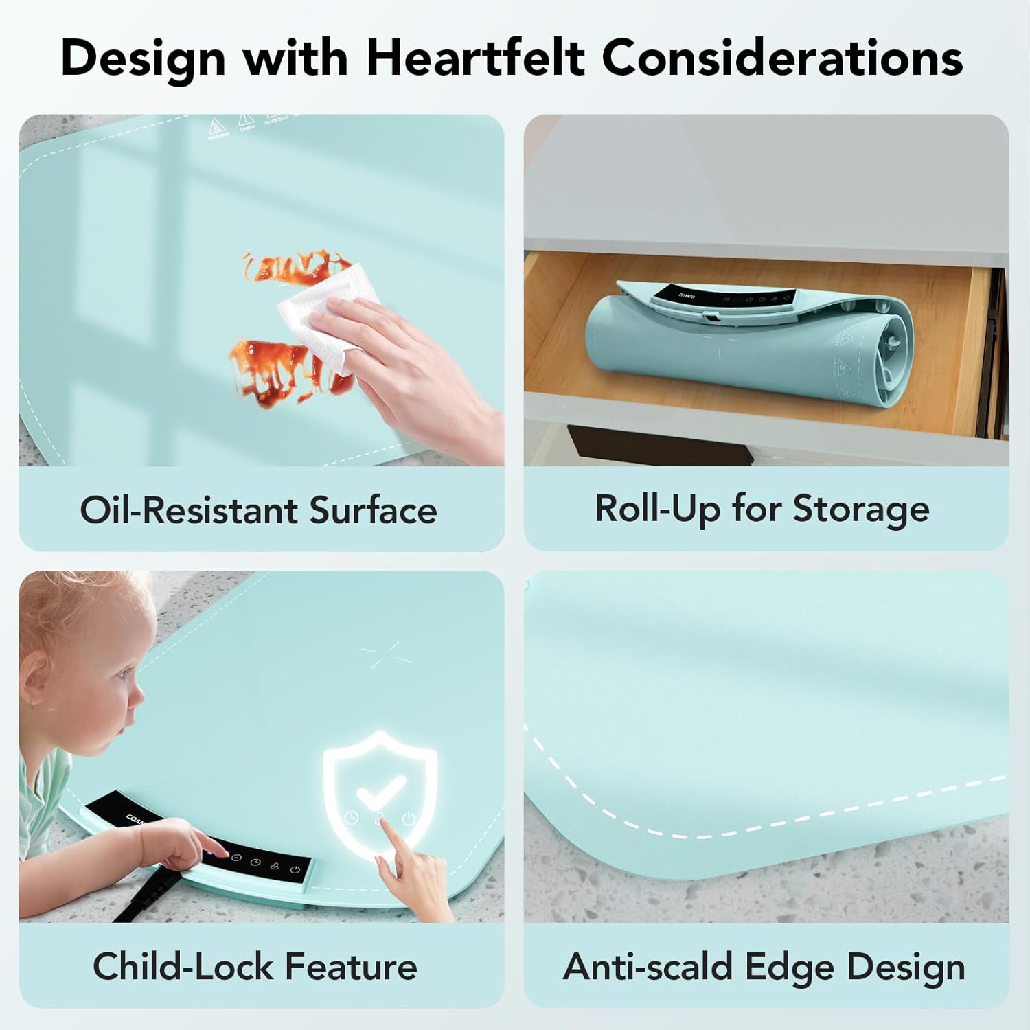 - [Durable & Easy to Maintain] Crafted from premium flexible silicone, our silicone food warmer mat is built to last. It's splash-proof, stain-resistant, and oil-resistant, and can be easily rolled up for storage. Cleaning is a breeze with just a quick wipe
