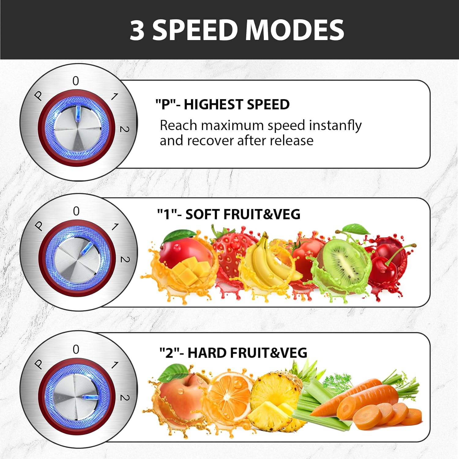 - 3 Speeds Mode: "1" low speed runs from 12000 to 15000 RPM for softer fruits like oranges, tomatoes and others; "2" fast speed runs from 15000 to 18000 RPM for harder fruits like carrots, celery, beets, kale and many others. āPā is the highest speed. (Reach maximum speed after release). Different juicing modes provide options for all produce