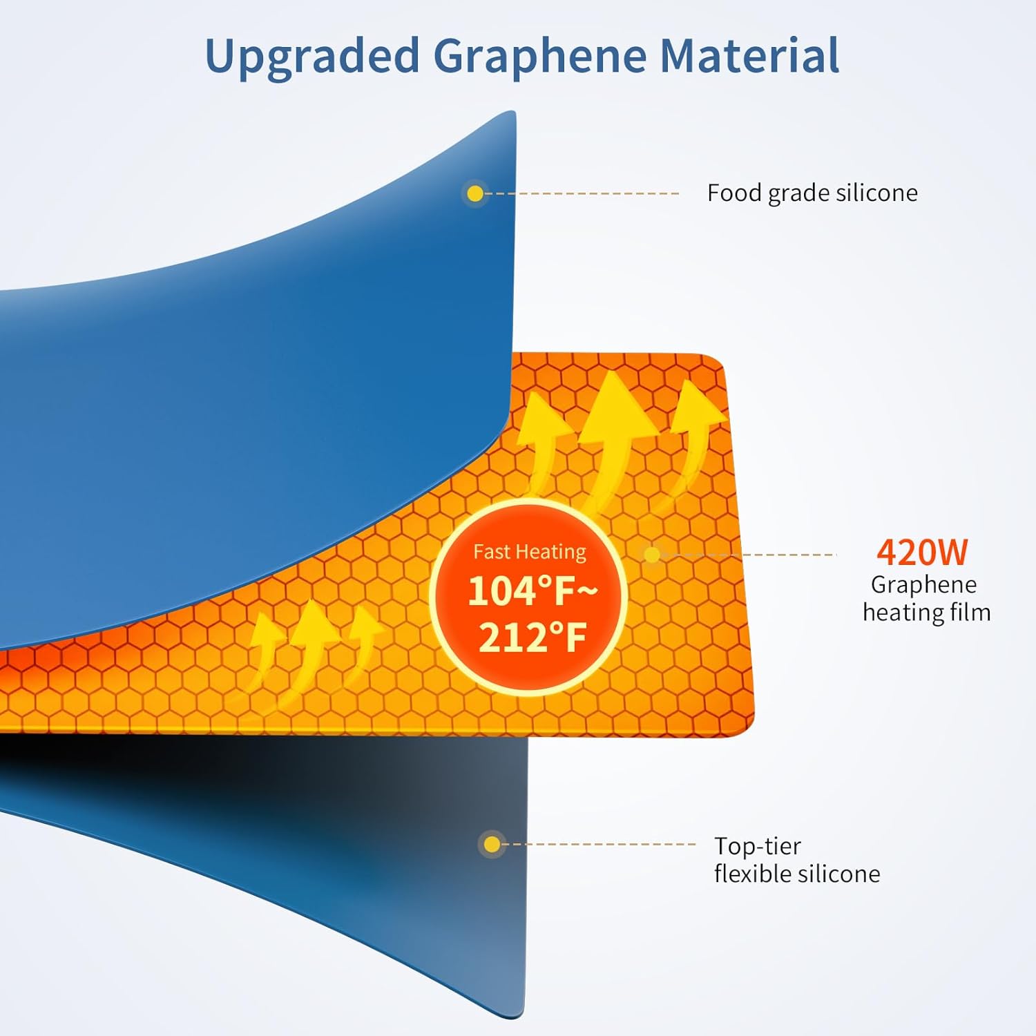 - 【8s Fast Heating with Graphene Tech】Our graphene heating mat for food features advanced 500W graphene PI material, heating evenly in just 8 seconds - perfect for keeping appetizers to desserts at ideal temperatures during gatherings. No more cold food at parties!