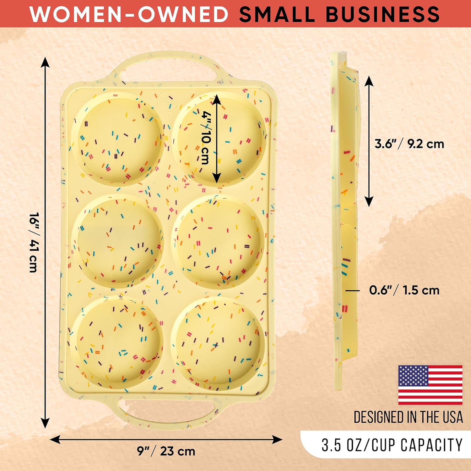 - JUMBO SIZE FOR BIGGER BAKES β Each silicone jumbo muffin pan has 6 cup capacity with a wide 4" diameter β perfect for those thick extra large muffin pan or jumbo cupcake pans recipes. Great for making whoopie pies, burger buns, and muffin tops that truly rise.