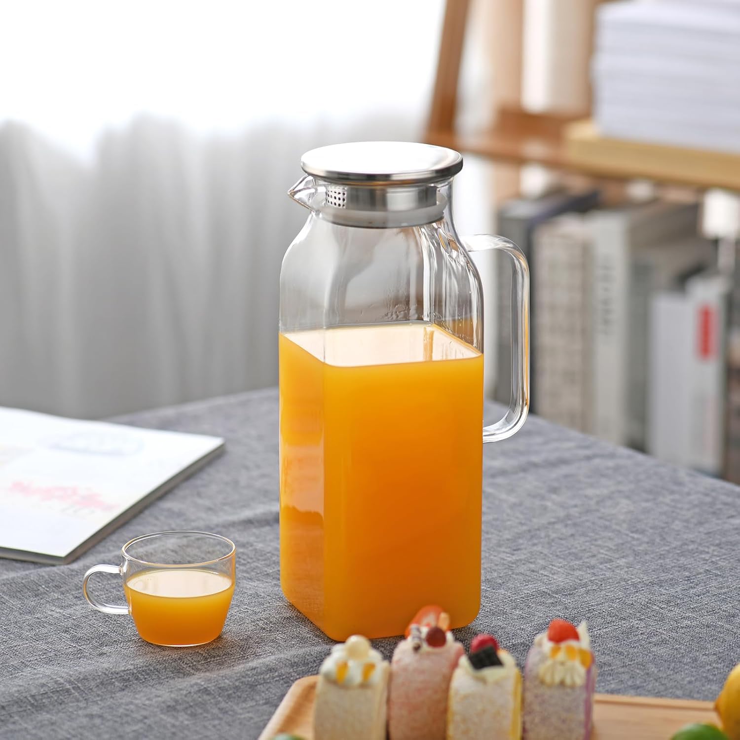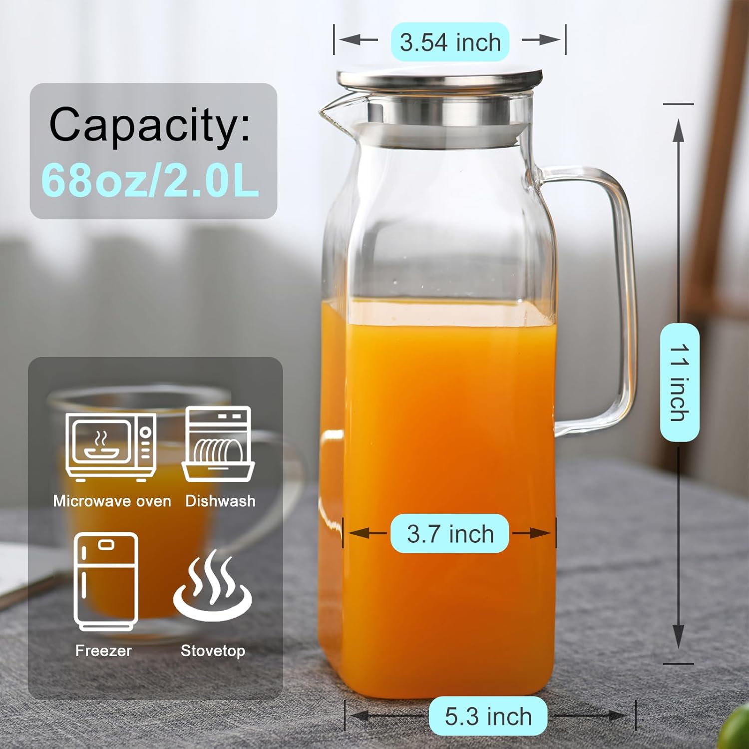 1.8 Liter Glass Pitcher with lid 60oz Glass Water Pitchers for Fridge Heat Resistant Glass Water Carafe with Handle for Party Water Jugs Tea pitcher Lemonade Iced Tea Jug Juice or Drinks