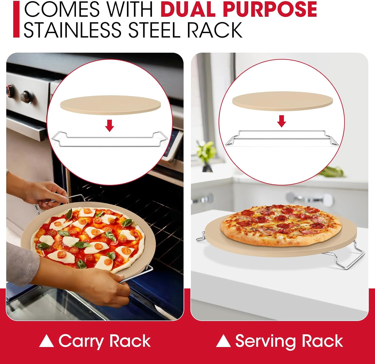 Unicook Round Pizza Stone for Oven and Grill 16 Inch, Oven Baking Stone for Bread, Cordierite Pizza Pan for Baking Crispy Bread and Cookies, Includes Carry Rack and Dough Scraper