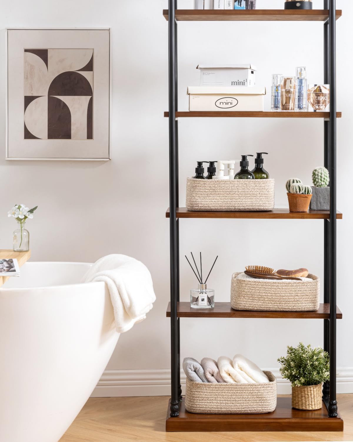 - [ Elegantly Designed to Match Any DΓ©cor ] Our small rope basket creates a minimalist appearance, and it adds a touch of warmth and texture to any room. The classic solid color design ensures seamless integration with your existing aesthetics, complementing any decoration. Perfect as decorative storage baskets for shelves, cabinets, and any open display space, making them a stylish and practical addition to any decor, enhancing the overall aesthetics of your room