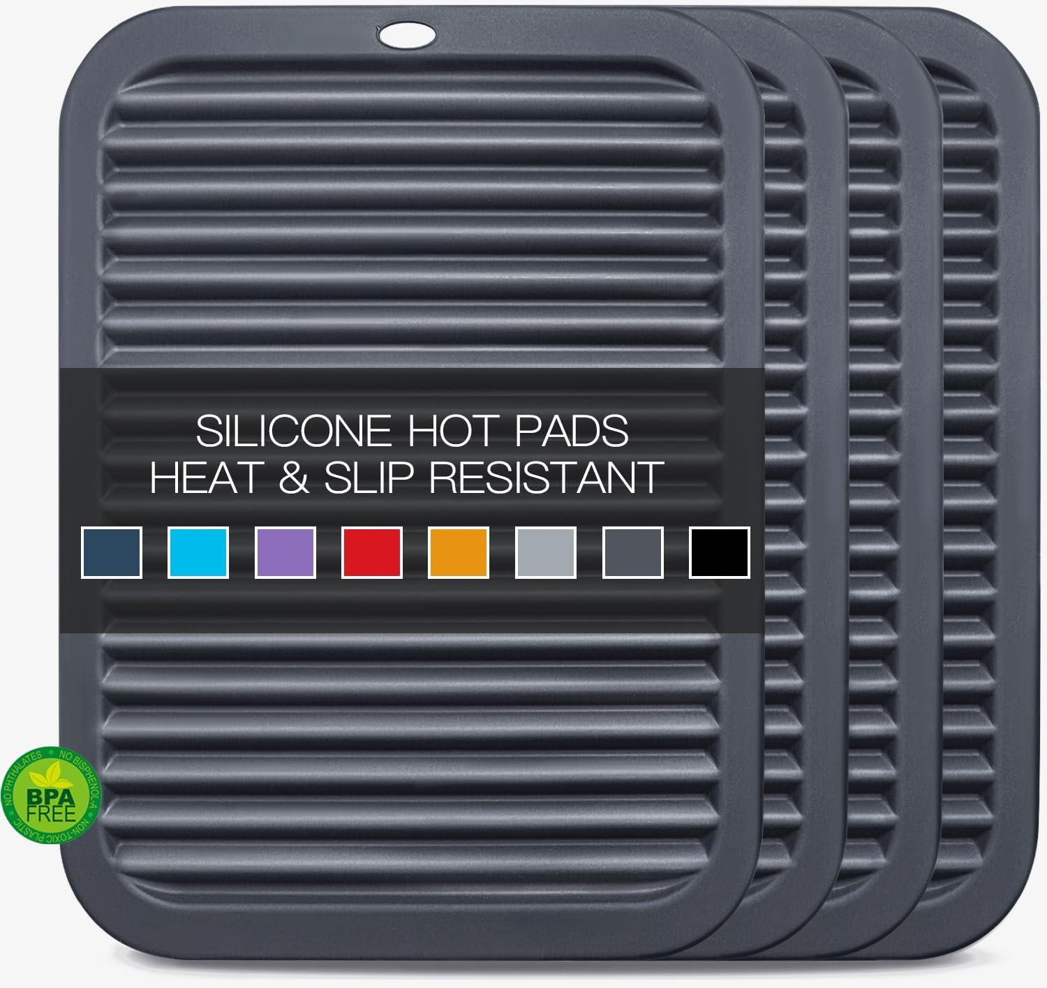 - 🍳Silicone Heat Resistant Mat: The 4 pack dark grey silicone trivets for kitchen heat resistance are -104℉ to 446℉. Safe to use for microwave, air fryer, oven, toaster, or freezer. Perfect protecting granite countertops, wooden tables, and glass tables from heat damage, scratches, stains, etc. Extend the life of the tabletop.