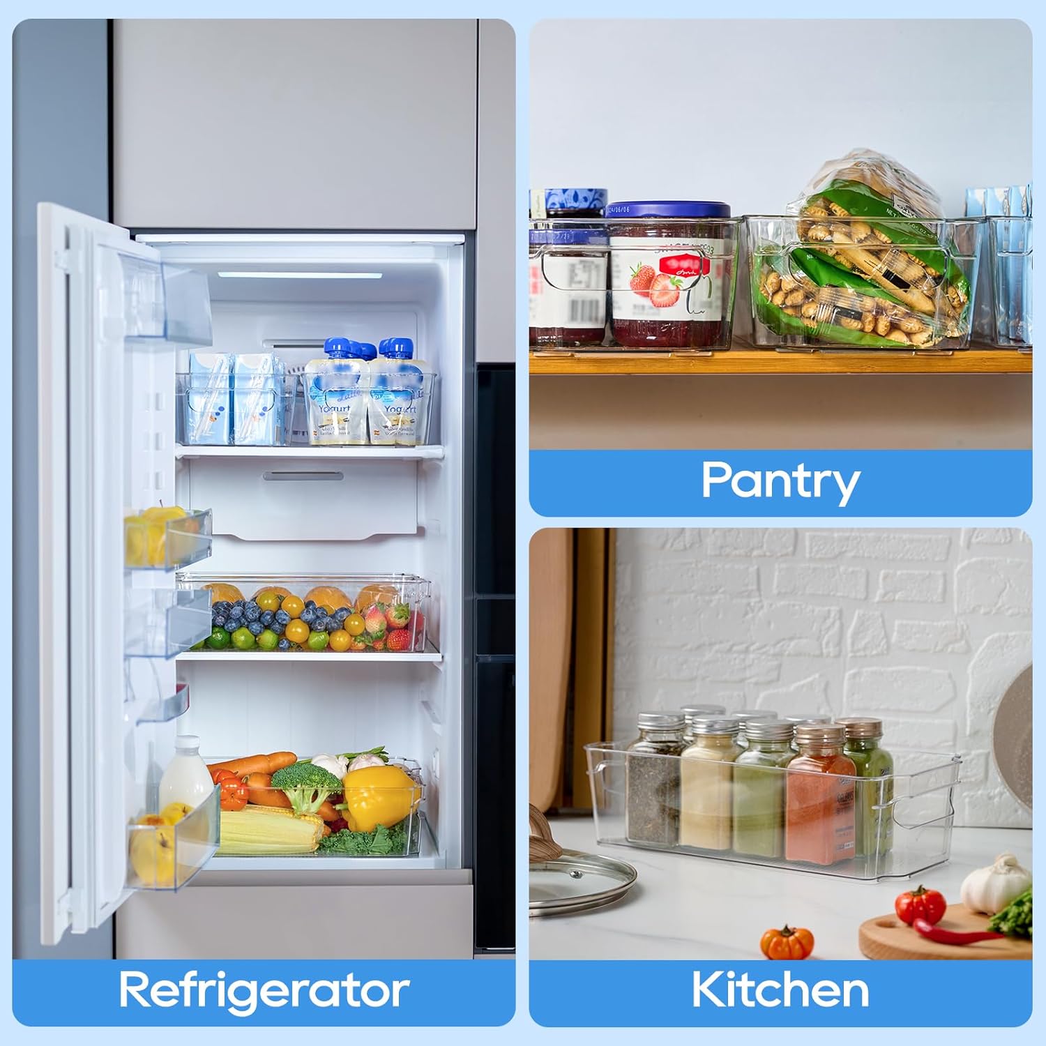 - Built-In Handles: These clear storage bins feature sturdy, built-in handles on both sides, making it easy to pull, lift, and slide them in and out of your fridge or pantry. The secure grip ensures effortless handling