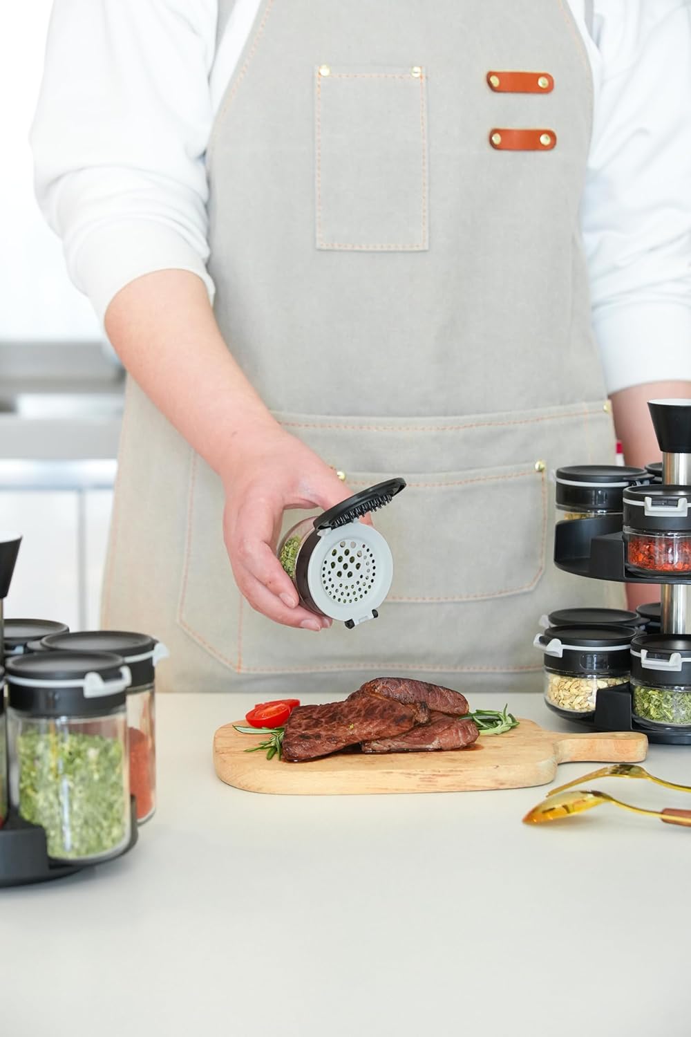 - ā High Quality Seasoning Rack: This innovative and made of high quality material makes cooking easier. It provides 3 in 1 option: you can pinch, scoop, and 2 sizes sprinkle. It takes a small amount of space whether on countertop or inside a cabinet. Each jar is made of high quality food grade thick glass for safe, hygienic and sturdy experience.