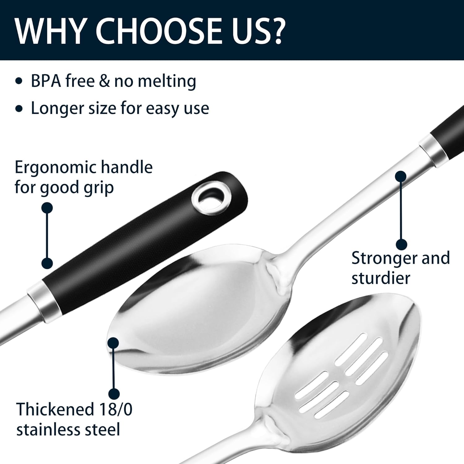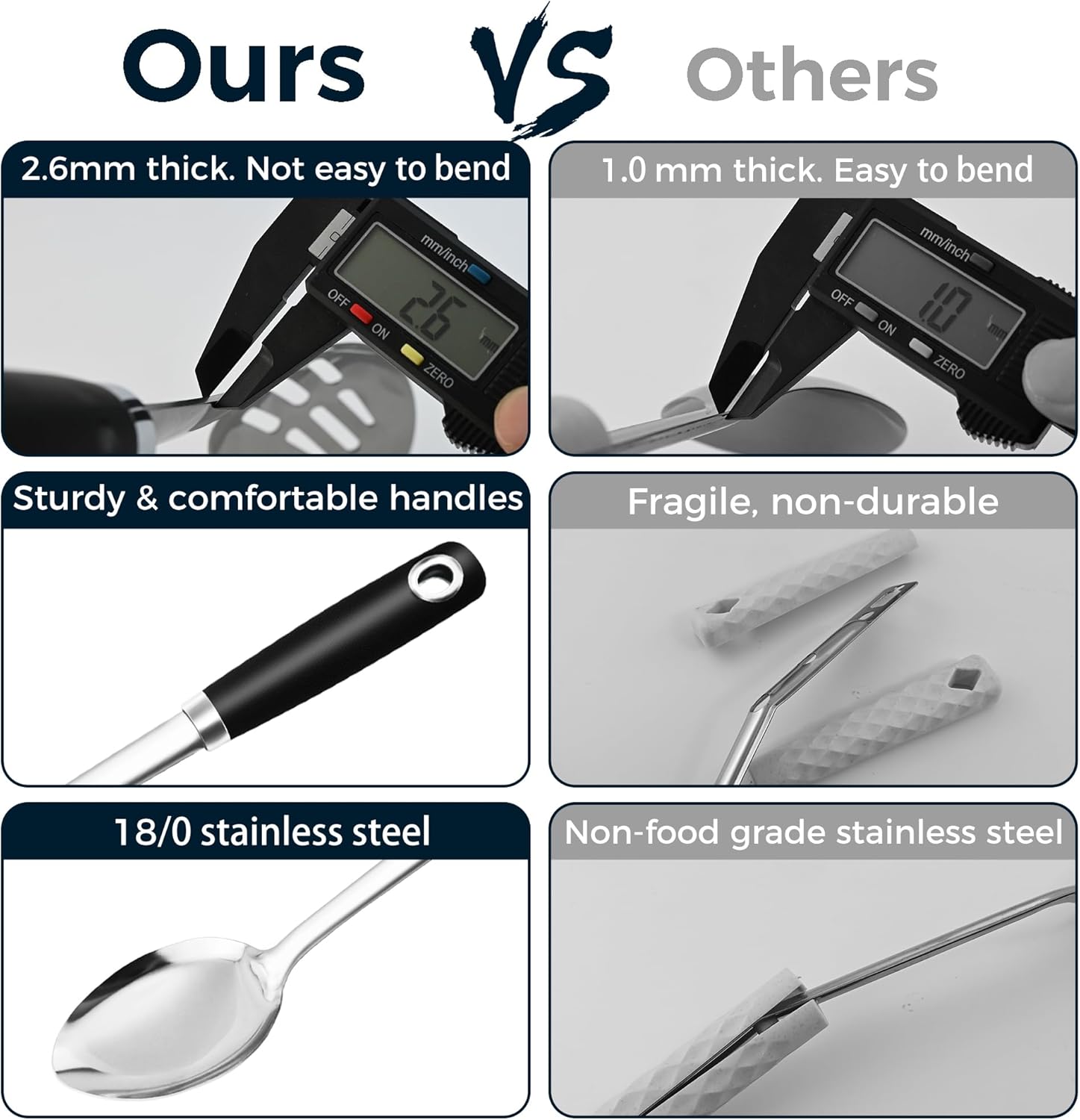 - HEAVY DUTY COOKING UTENSIL SET - This stainless steel cooking spoon set has thick and long handle and good heat insulation. That makes us feel comfortable to use them. And