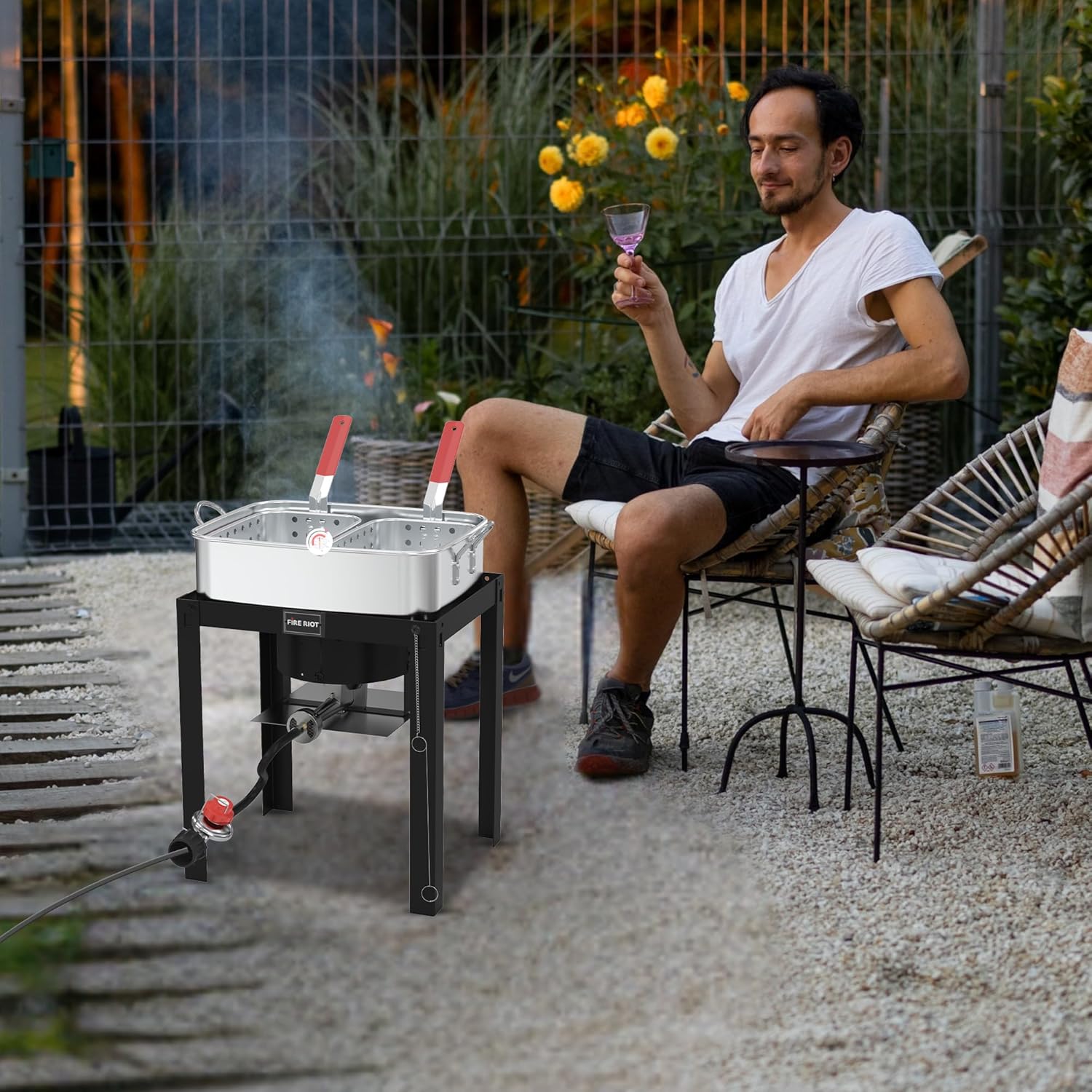 - DUAL BASKETS DESIGN: Easily prepare two dishes at once with our outdoor fryer set, featuring dual strainer baskets for hassle-free cooking. Our double basket deep fryer equipped with heat-resistant silicone handles and an ergonomic grip, it en-sures safety and comfort. Perfect for fish fries, BBQs, camping, or parties, itβs a time-saving solution for both family gatherings and professional chefs!