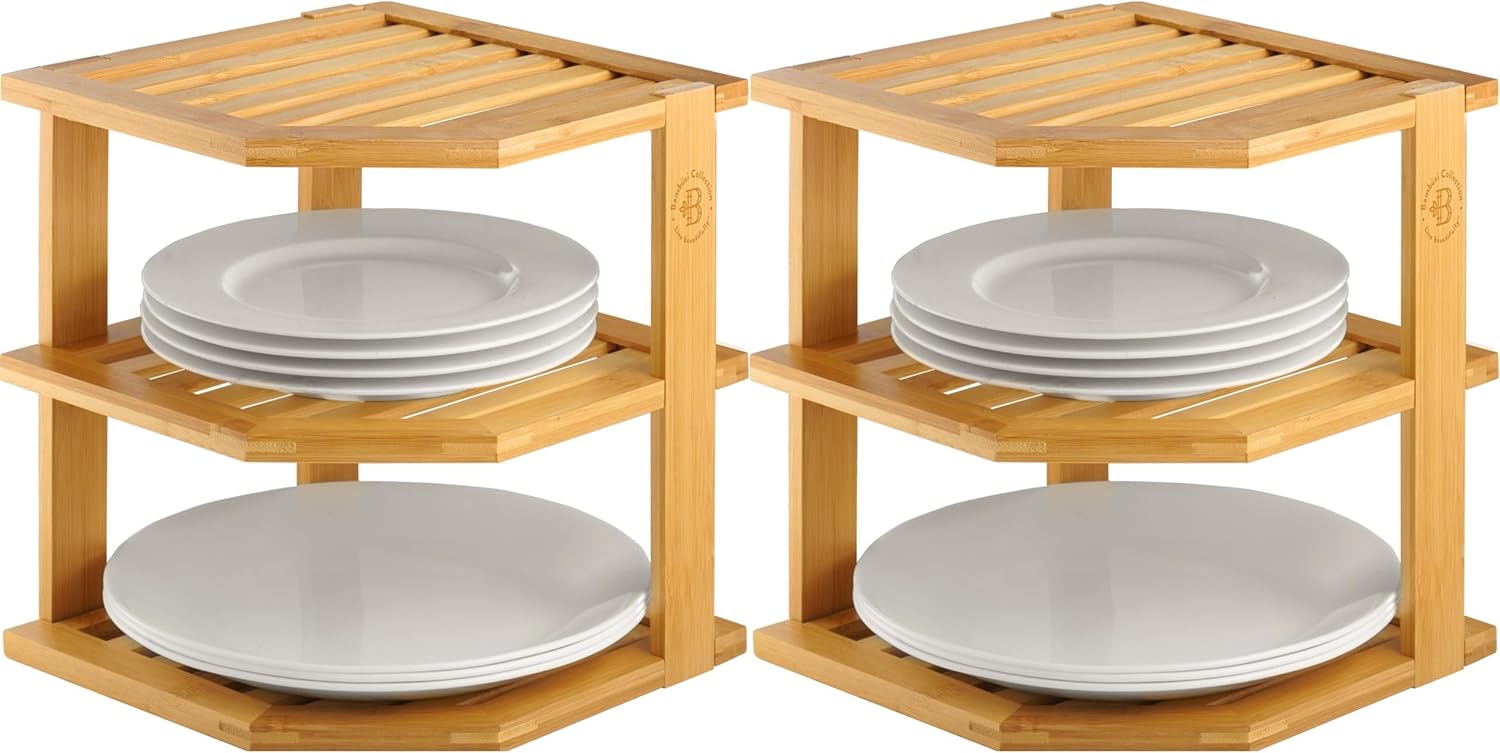 2-Pack Plate Organizer for Cabinet - Bamboo Corner Shelf for Kitchen or Bathroom Storage, Space-Saving Rack for Dishes, Countertop, Cabinet, Pantry - Organization & Housewarming Gift