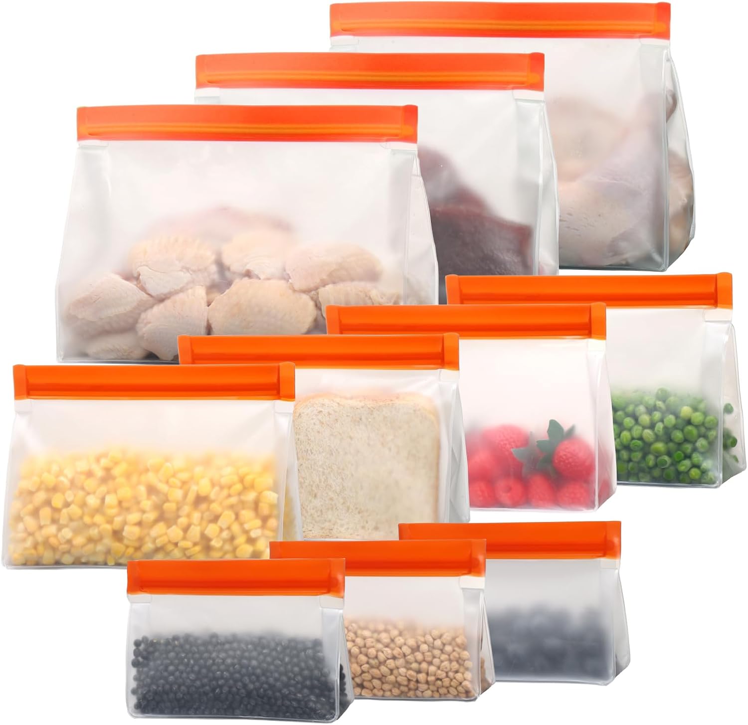 iSPECLE 10 Pack Freezer Bags - 3 Pack Gallon Bags 4 Pack Sandwich Bags 3 Pack Snack Bags BPA-Free Reusable Freezer Bags with Stand-Up Bottom and Label, Leakproof to Keep Frozen Food Fresh, Orange