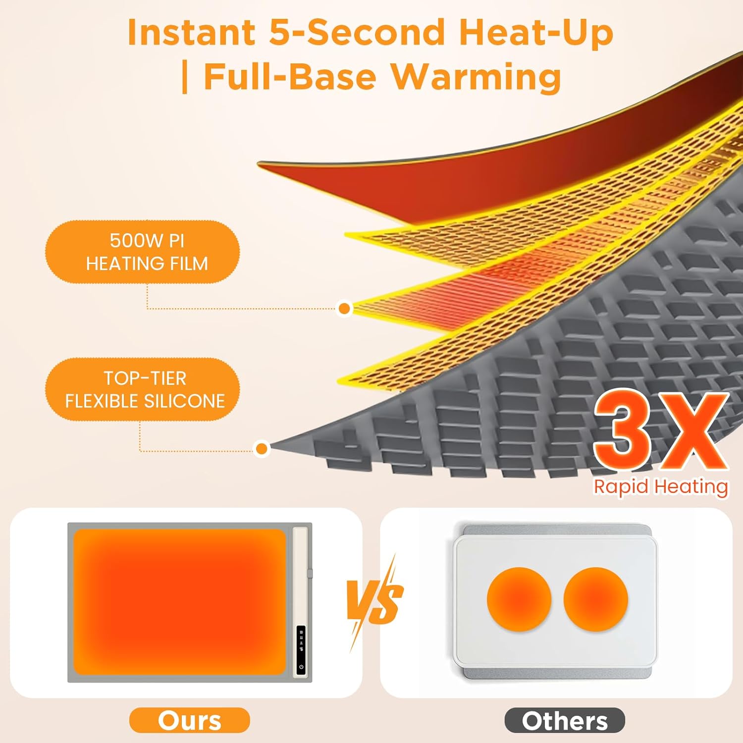 - Premium Silicone Nano Material: Our electric warming tray is made of top-grade flexible silicone nano material. It is splash-proof, stain-proof and oil-proof. The innovative foldable design solves the common bulky and inconvenient storage problems of traditional heating trays, and can be easily and compactly stored without wrinkling, ensuring long-lasting quality.