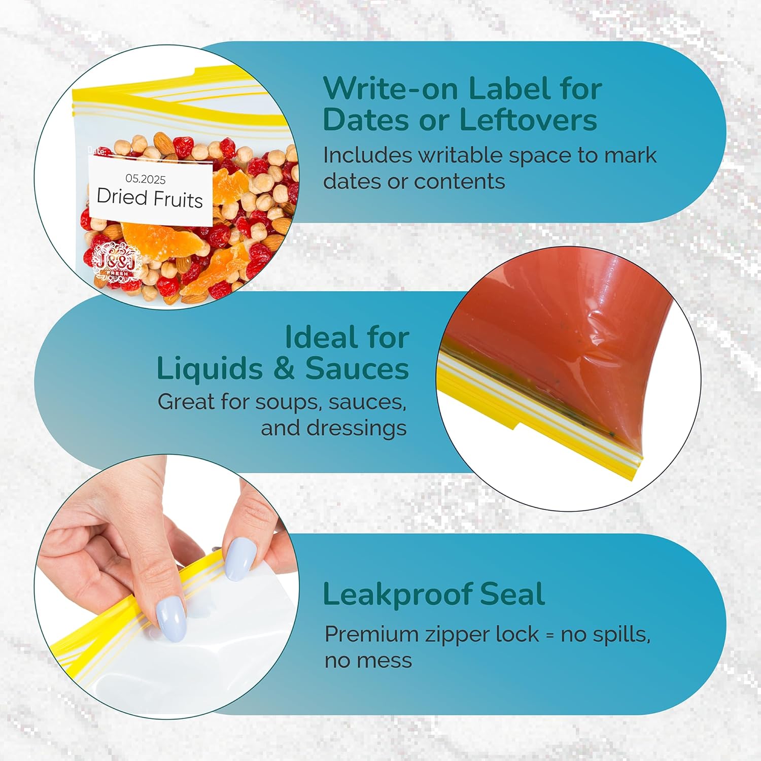 J&&J Fresh Storage Snack Bags, 50 Pack — Reusable Snack Bags, BPA-Free, Leakproof — Expandable Bottom, Microwave-Safe, Strong Zipper Lock Seal — Snack Bag for Freezer & Fridge — Durable & Washable