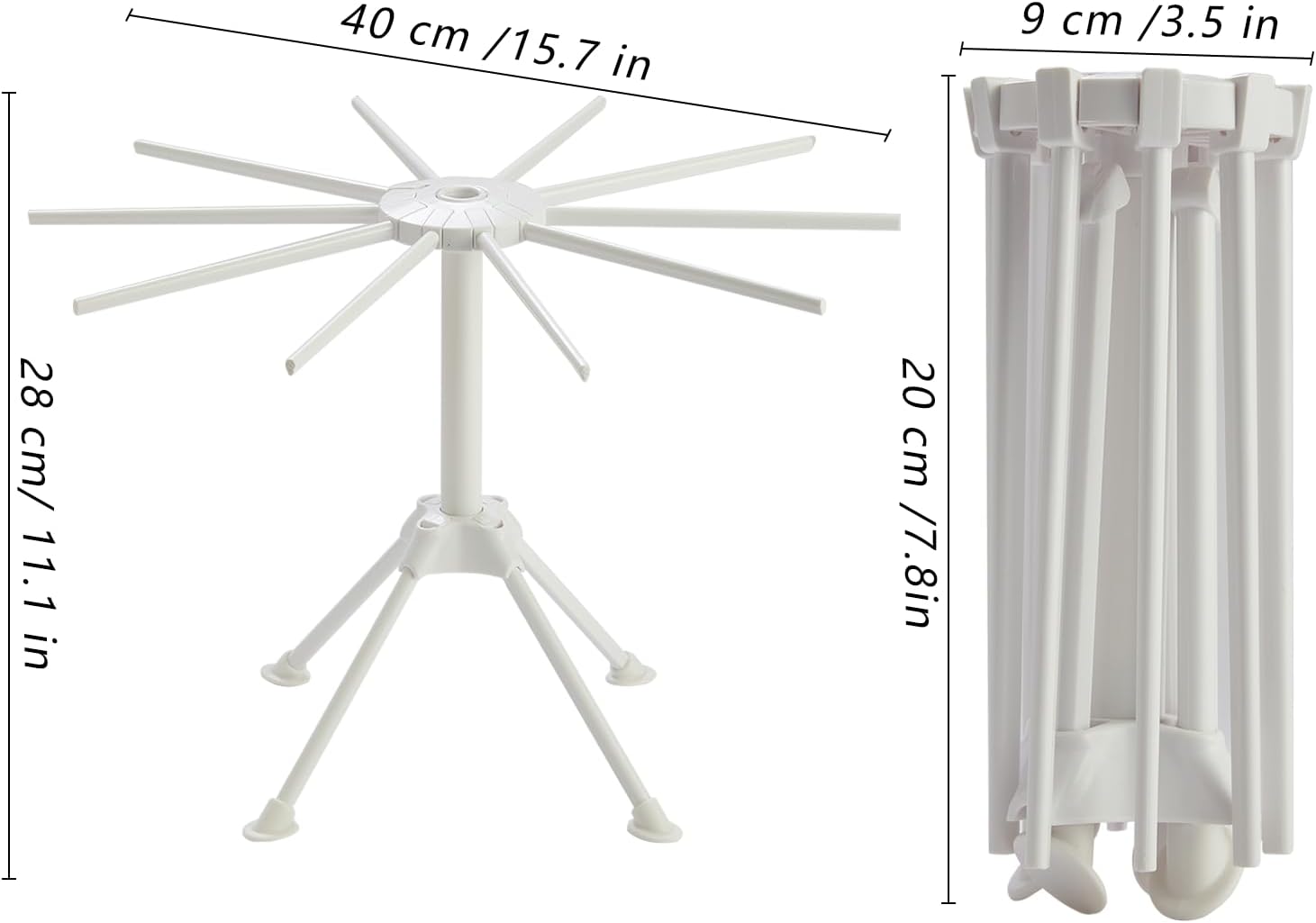 - 【Collapsible】With 10 hanging arms and 4 feet, it unfolds out into a tall rack with plenty of room to hold pasta. The folded size is 7.8 inches in height and 3.5 inches in width. It folds into a compact cylinder to save space in small kitchens and RVS.