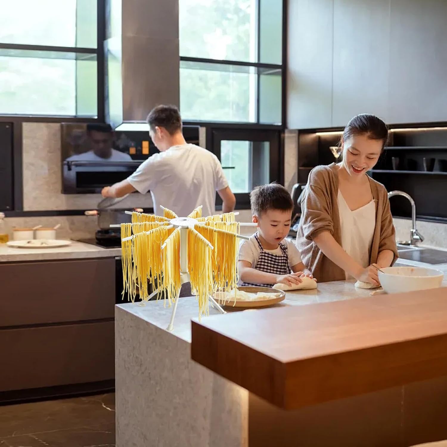 - 【Easy to Use】No screw and tools needed for assemble and disassemble. The bottom of the pasta dryer rack has 4 sturdy non-slip feet to extend stability, so you can use the noodle drying rack without worrying about it falling over.