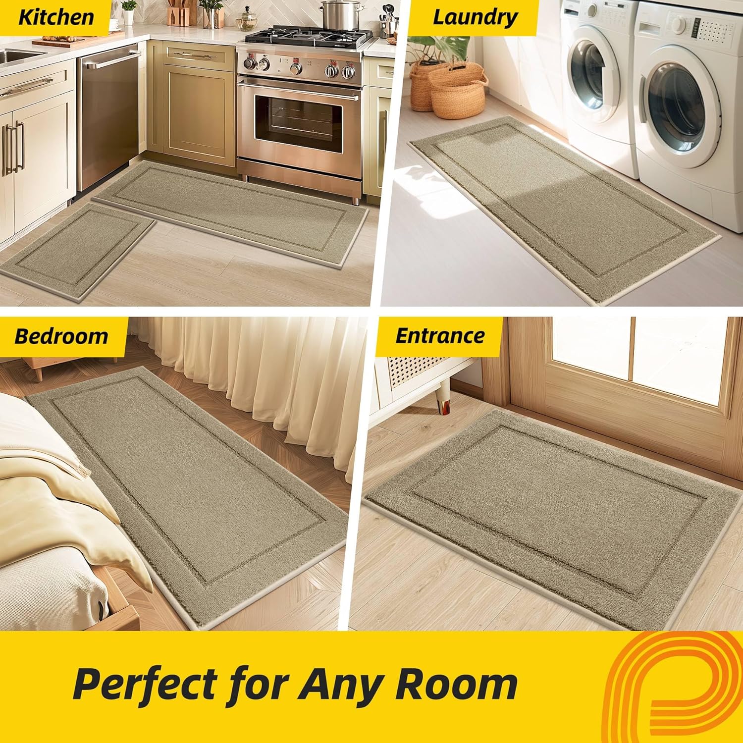 - Absorbent and Quick-Drying: Our two-layer polyester design quickly absorbs spills and moisture, keeping your kitchen, bathroom, or laundry area dry and safe. The kitchen rug set is Perfect for high-humidity spots or areas prone to liquid splashes.