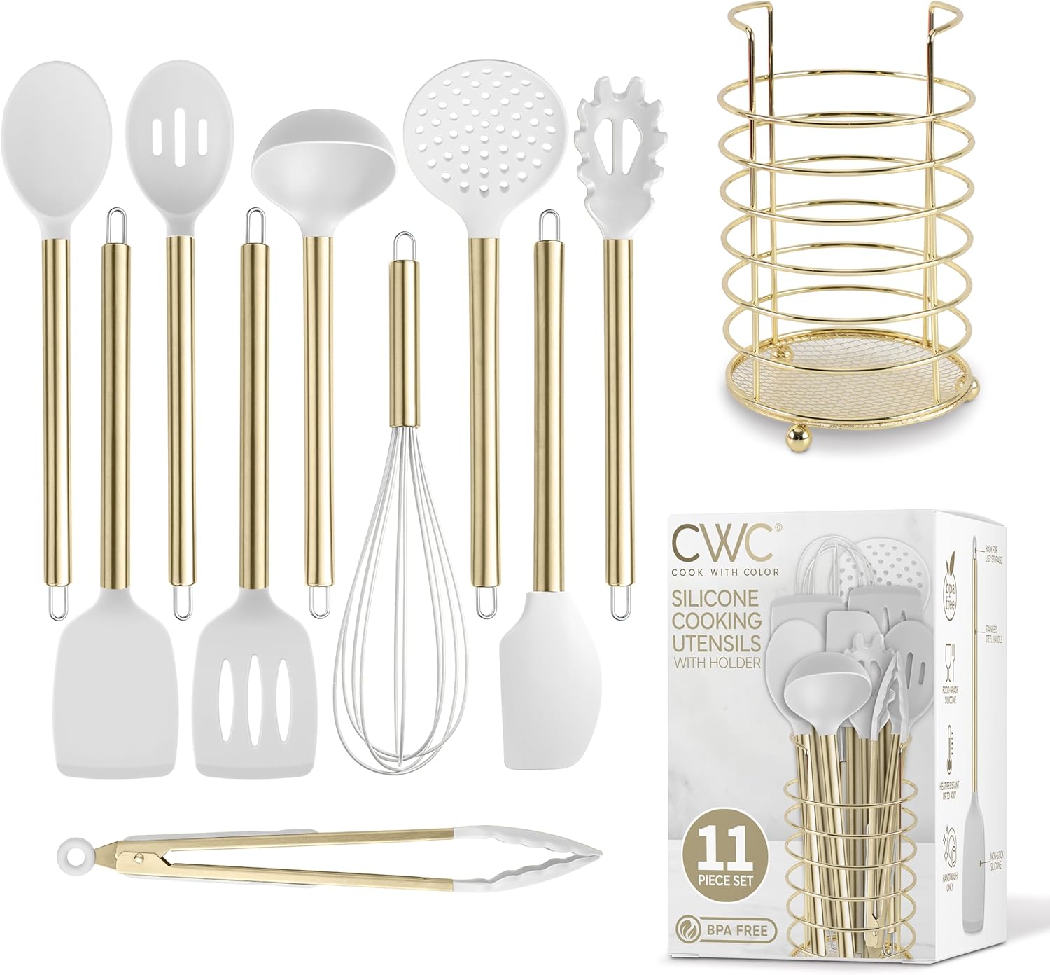 - Gold utensil set with metallic tones, this set of silicone kitchen tools has an up to date, trendy look that is madly in line with the current styles and trends. Add a splash of color and funk to your kitchen and hang from the rings on each utensil.