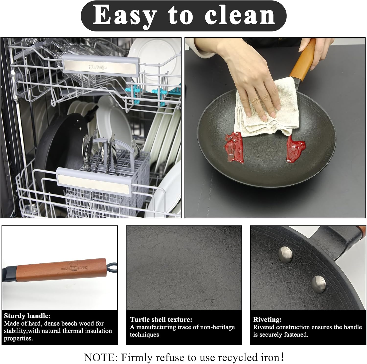 - Practical Size, Timeless Spirit Pan size: 10.24" diameter, 1.97" deep, 7.48" handle, 2.1 lb. (Ideal for 2-4 people) Works on gas, electric, ceramic, and induction stovetops. The detachable wooden handle stays cool and makes it oven- and dishwasher-safe. A perfect blend of Chinese tradition and modern convenience
