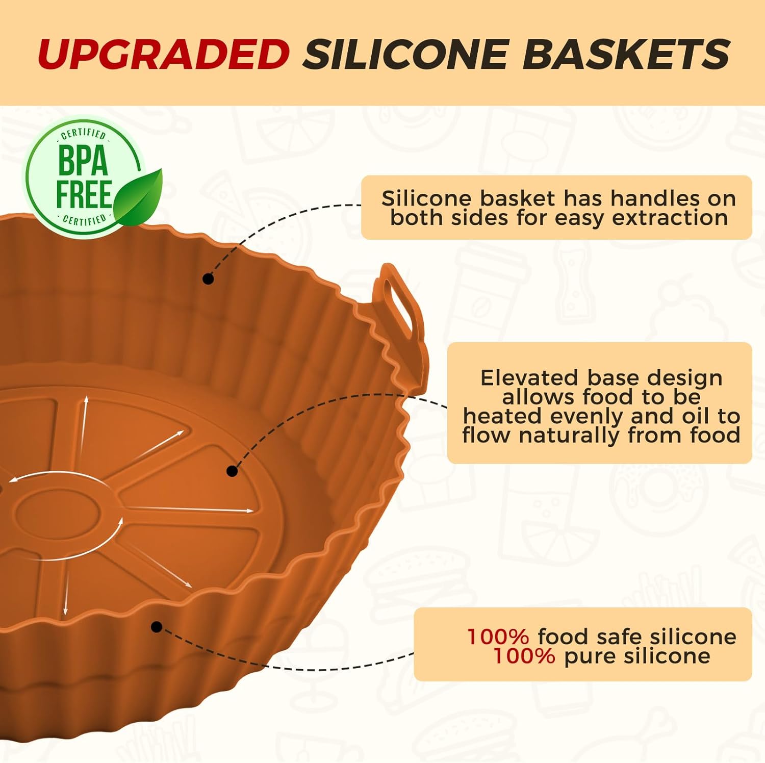 - 【Heat Resistant & Food-Safe】- The air fryer silicone liners are made of safe food-grade silicone, BPA free, Non-toxic, Non-stick, scratch, abrasion, tear, dirt resistant and high-temperature heat resistant up to 428 ℉ (220℃), perfect replacement of flammable disposable parchment paper liners. Our silicone air fryer liner is reusable, will not deform or damage after hundreds of uses, it is the most valuable air fryer accessory