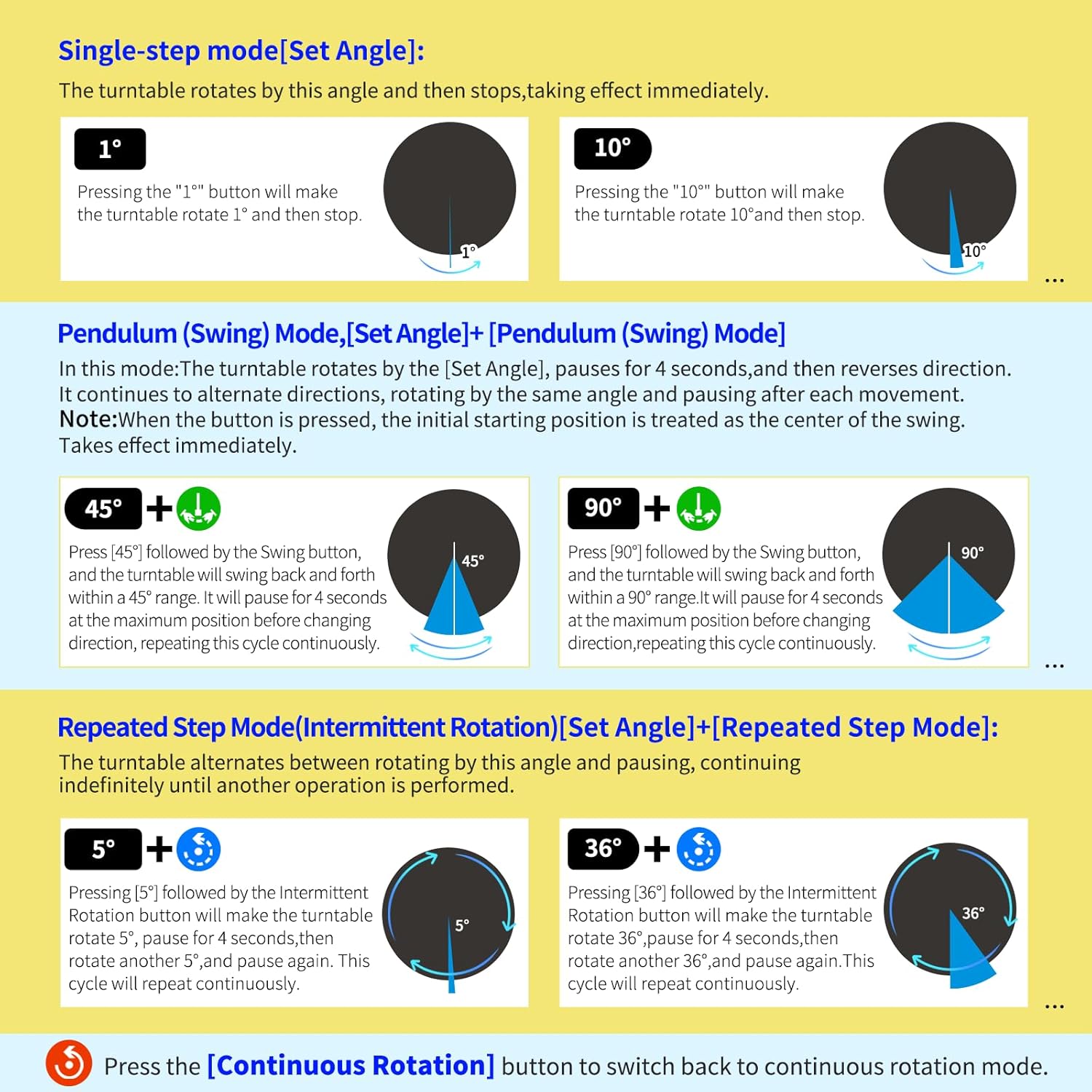 - 【This Motorized turntable includes a Professional Flagship Remote Controller】:Precise angle settings and user-friendly combination key design enable support for a wider range of applications. Support: Set the current position as the origin point (used in conjunction with the "Return to Origin" button). Support: Save the current settings to the turntable's internal flash. More versatile angle buttons and mode button combinations provide greater flexibility for various applications