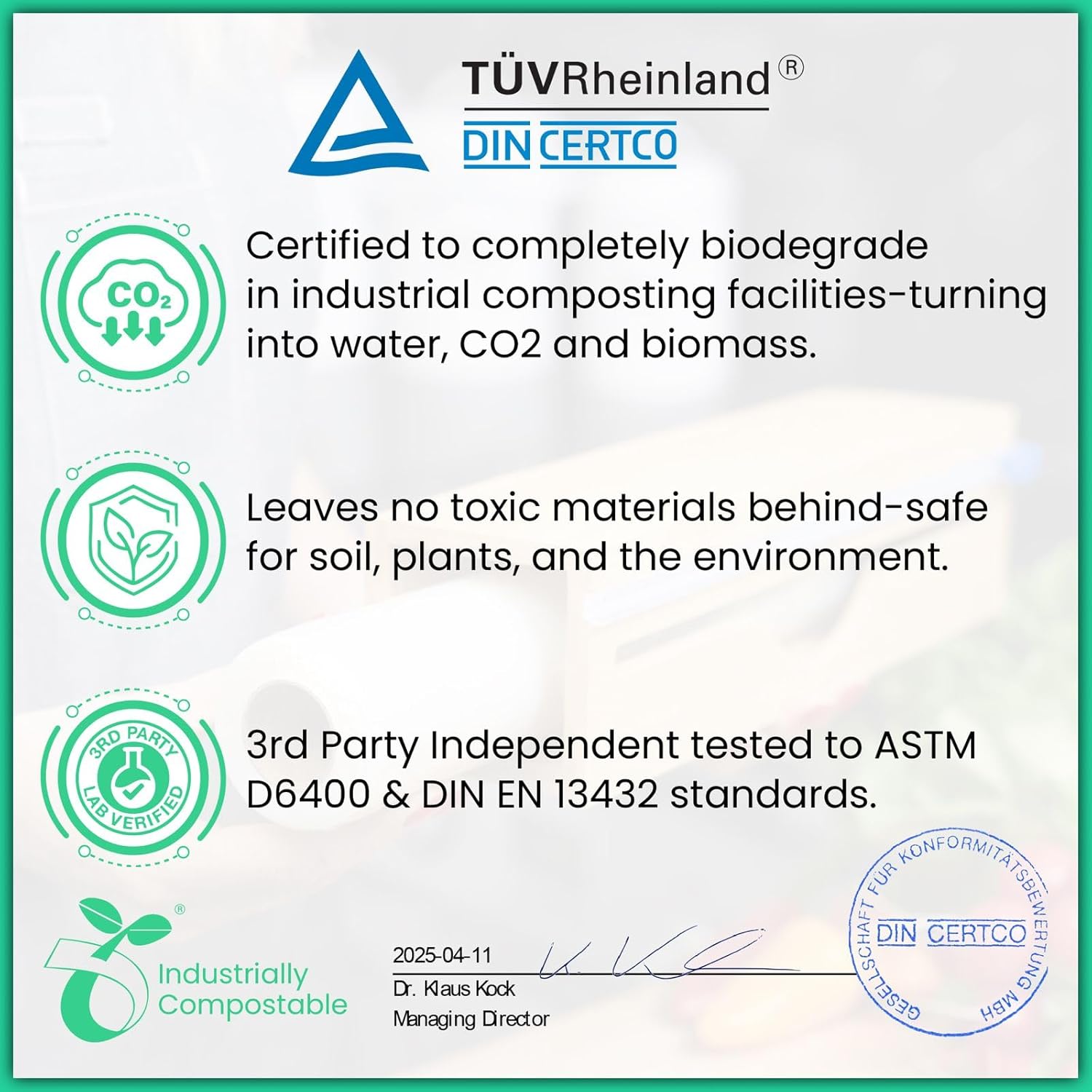 - CERTIFIED COMPOSTABLE & BIODEGRADABLE: Proudly ASTM D6400 & DIN EN 13432 certified, this plastic wrap meets rigorous standards for compostability, breaking down naturally in composting systems to reduce waste.