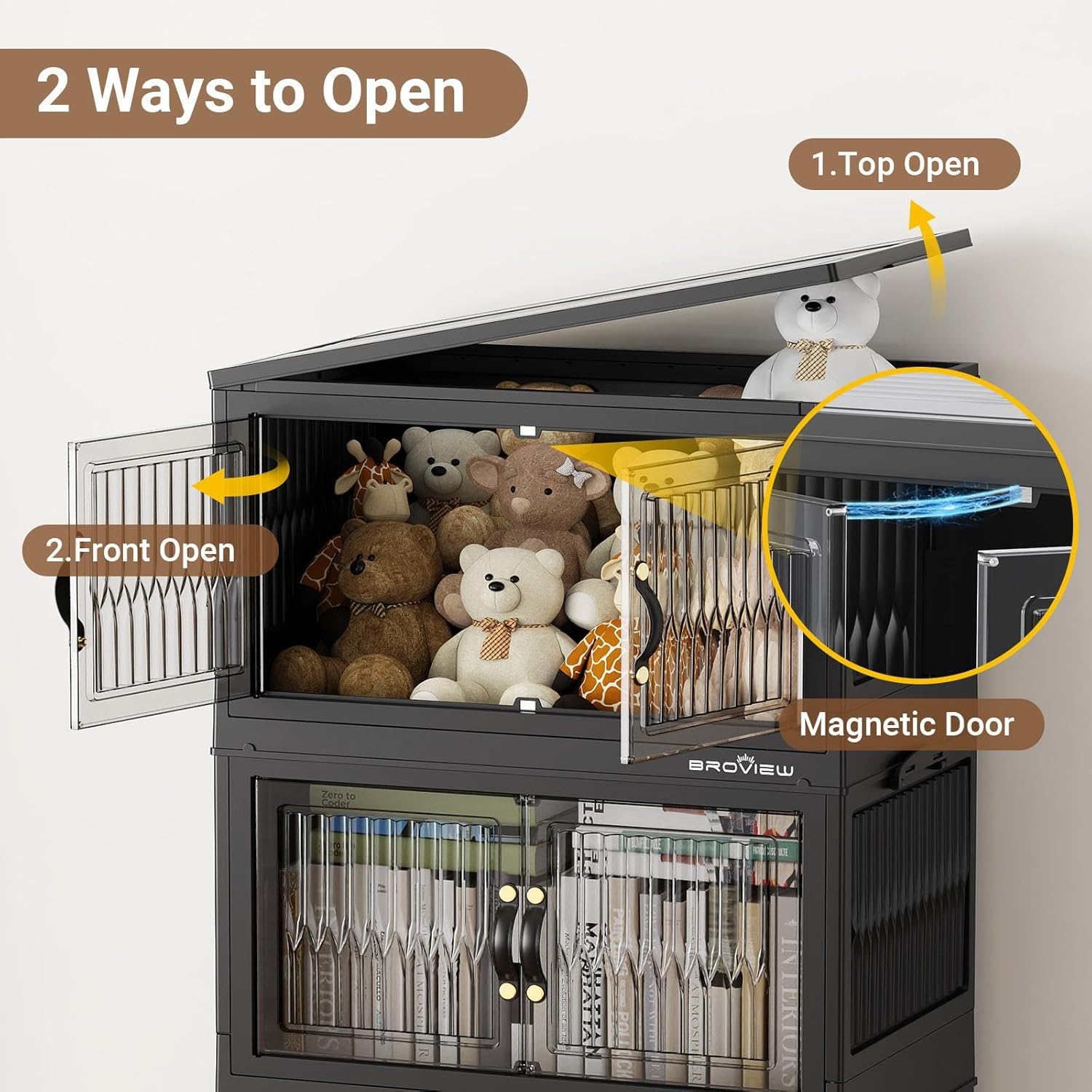 - 【Magnetic Front Open Doors & 4x Wheeled】The large storage bins with doors provide two options: front doors opening or top lid opening. The brown door can be easily seen through and with a magnetic device. The 4x 360-degree rotating wheels all have fixed functions and can be easily moved by releasing the valve, making them friendly to the elderly.