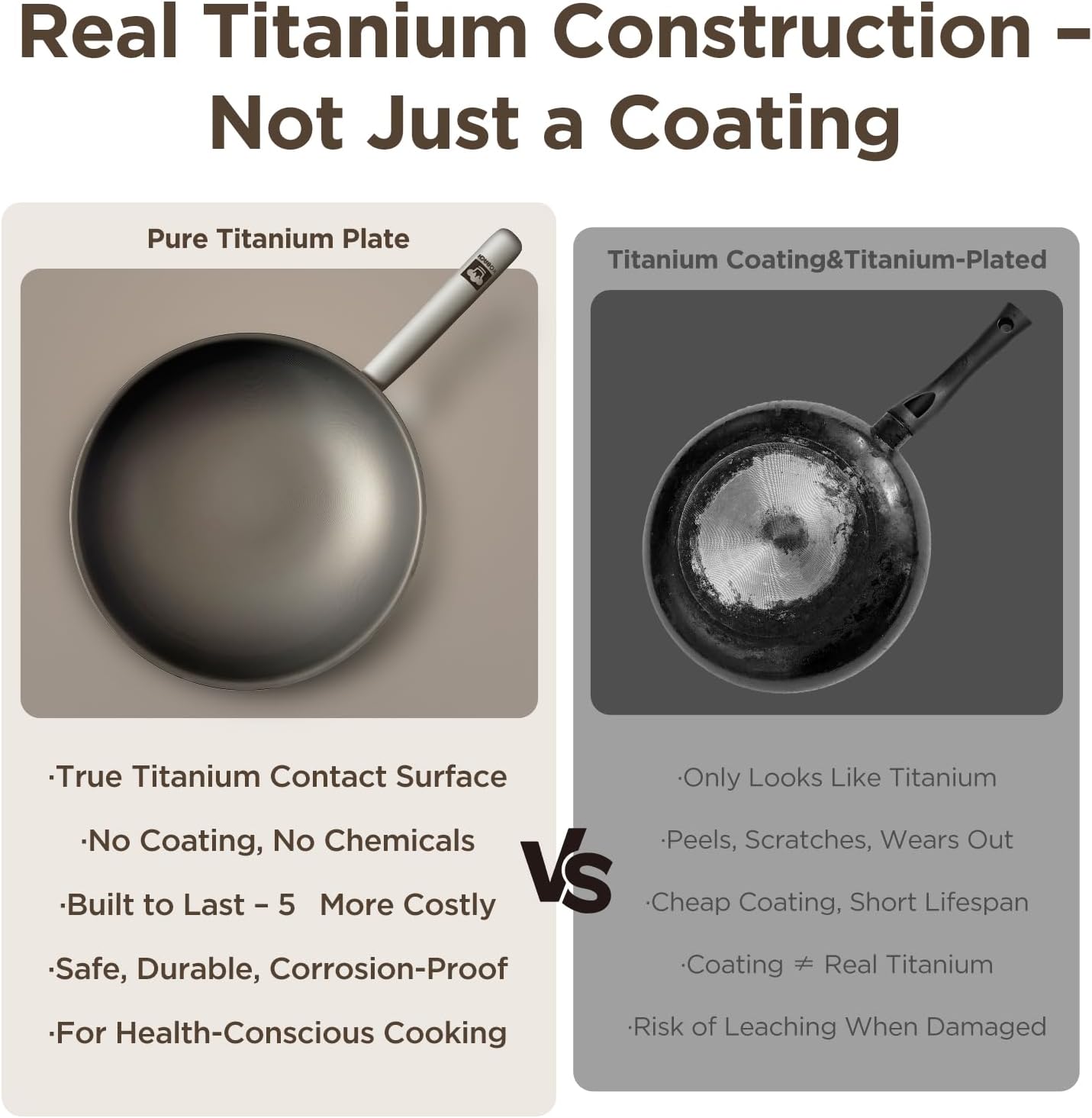 - 【Pure Titanium Durability】Made from 100% pure titanium, this cookware is corrosion-resistant, high-temperature durable, and free from harmful substances for a safe, healthy cooking experience. Lightweight yet strong, it prevents chemical reactions, preserves food’s natural flavors, and resists metal utensil damage. The zero-coating design ensures worry-free, long-lasting performance.