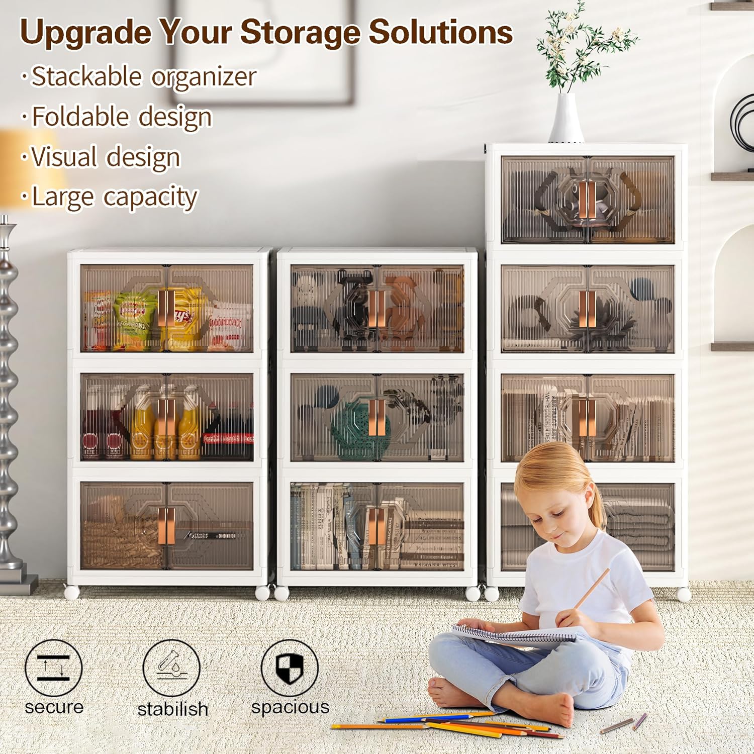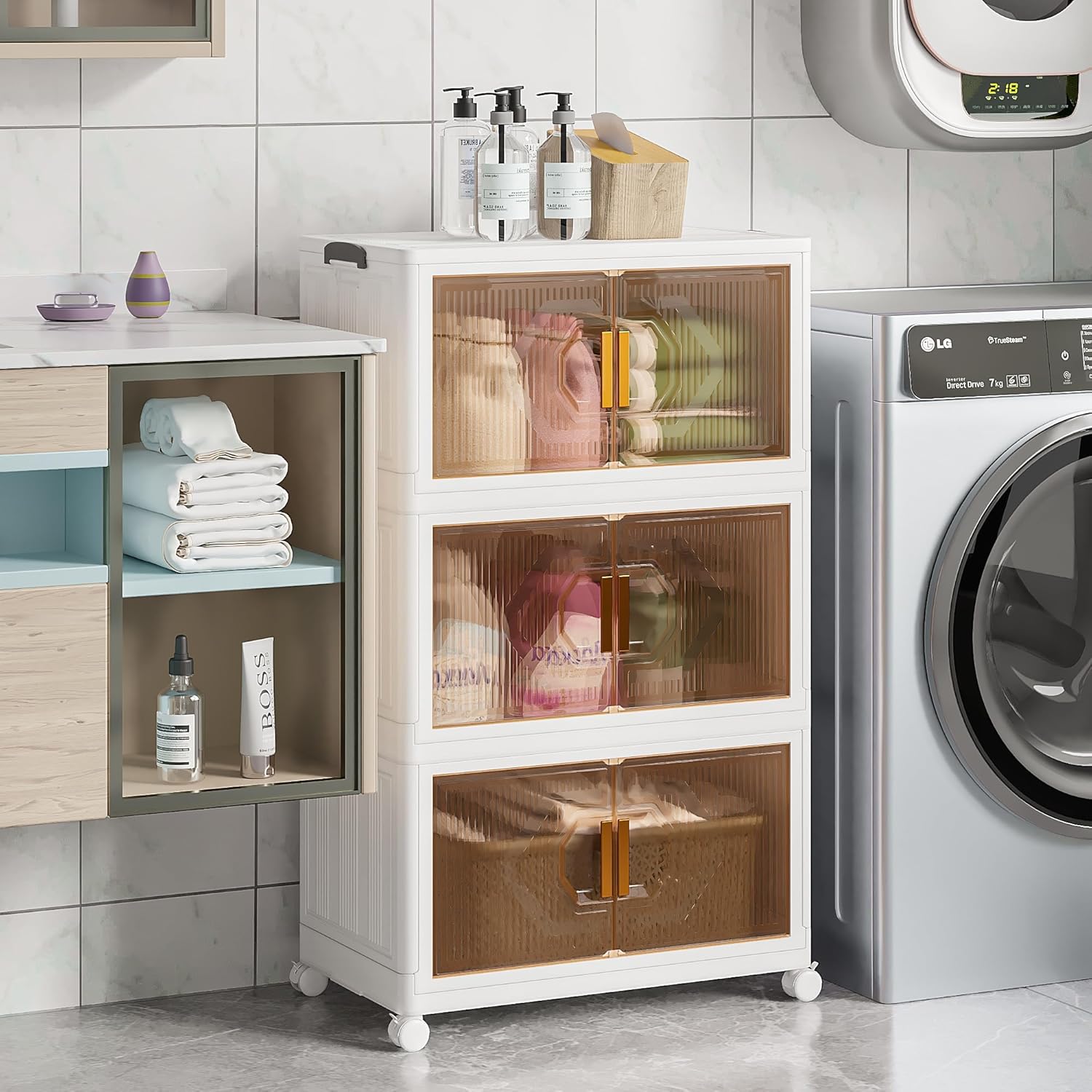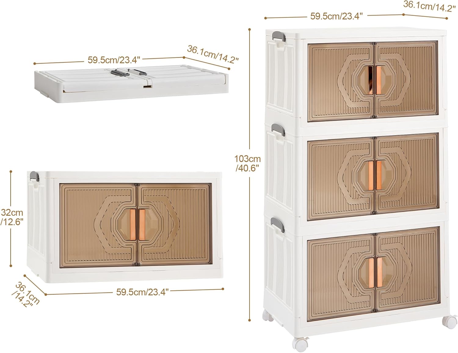 - ăTwo Opening MethodsăThe wheeled folding storage cabinet can be opened in two waysâeither through the top lid or the front door. The magnetic lock dual-opening doors, coupled with transparent windows, facilitates easy organization and access while preventing dust. The charming rectangular door of the foldable storage box adds a modern and stylish touch to your home decor.
