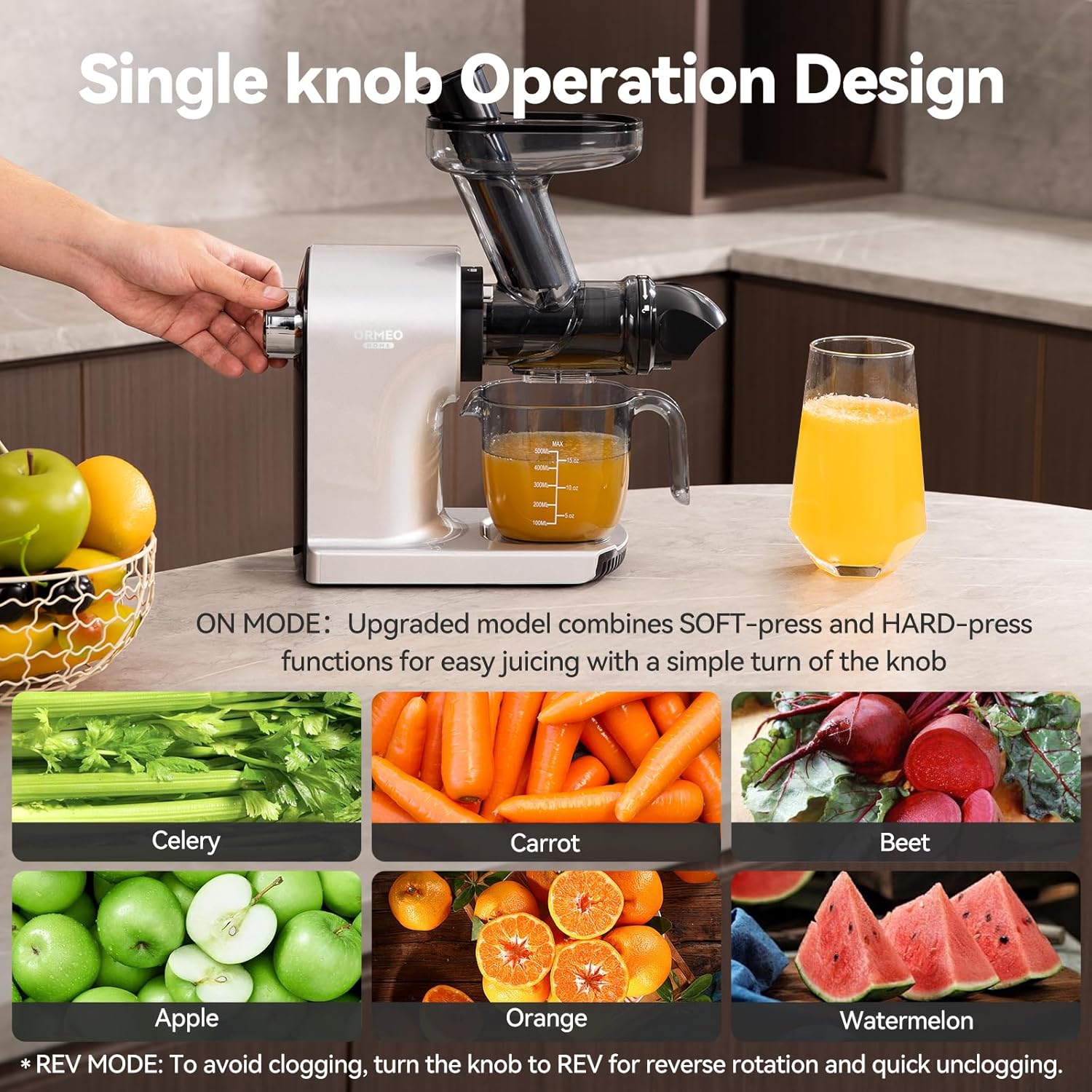 - ăSingle Knob Controlă Our upgraded slow masticating juicer combines soft and hard pressing modes. Simply add fruits or vegetables, turn the knob to "ON" to start juicing, and help prevent clogging. The juicer also includes a reversing function, making juicing effortless.