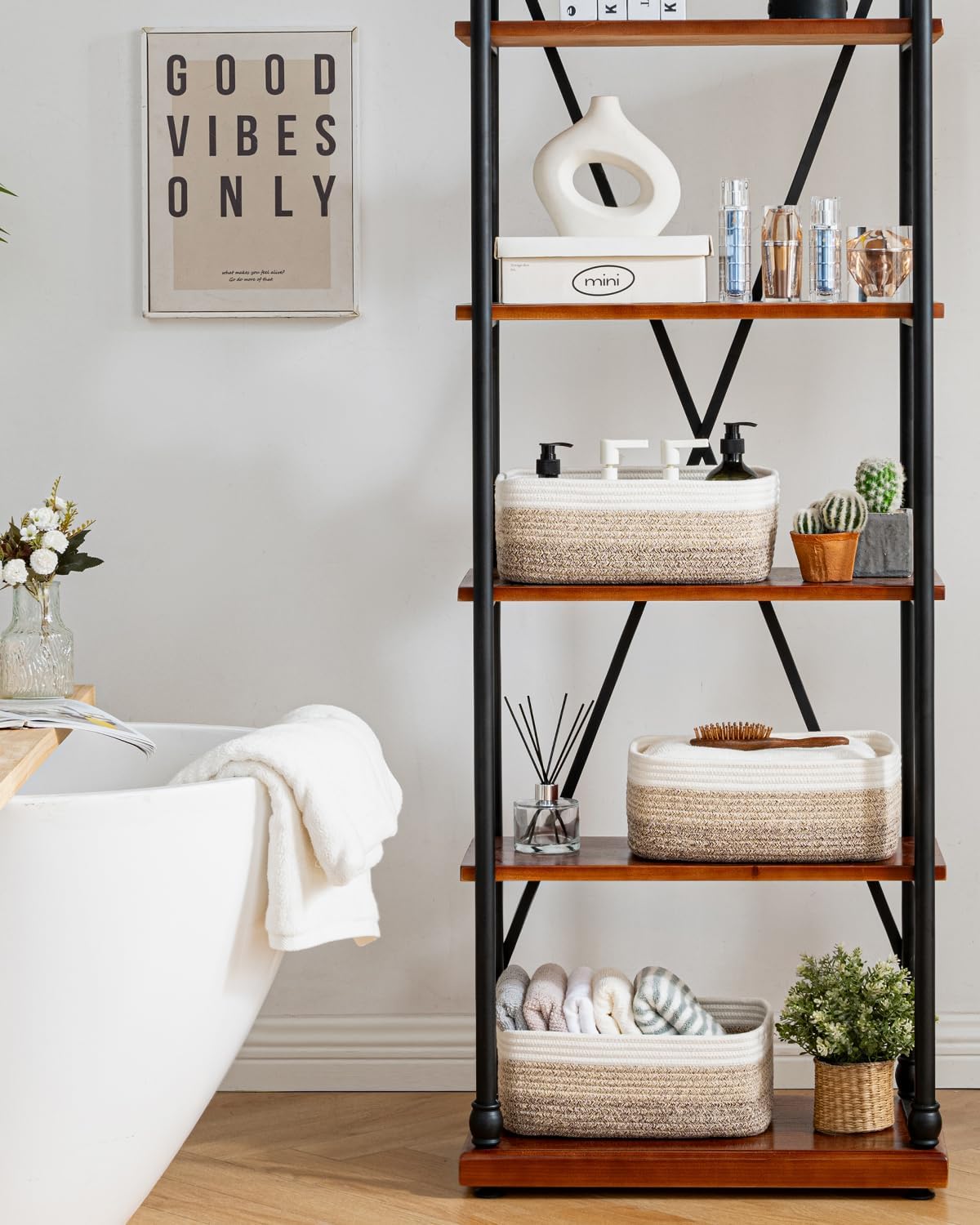 - [ Elegantly Designed to Match Any DΓ©cor ] Our small rope basket creates a minimalist appearance, and it adds a touch of warmth and texture to any room. The classic solid color design ensures seamless integration with your existing aesthetics, complementing any decoration. Perfect as decorative storage baskets for shelves, cabinets, and any open display space, making them a stylish and practical addition to any decor, enhancing the overall aesthetics of your room