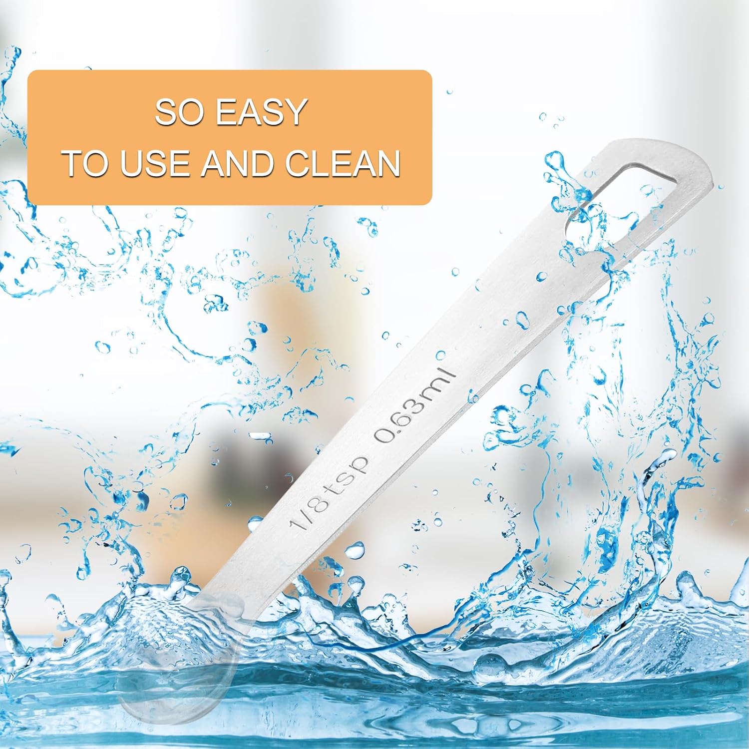 - 【Thoughtful Design】Our 1/8 tsp measuring spoon is thoughtfully designed, combining the essence of the cup-shaped round head design and the long handle design. This allows the small measuring spoons to easily penetrate into spice jars and other small containers, effectively overcoming the problem of spice spillage and spoon storage, bringing you an unprecedented convenient experience