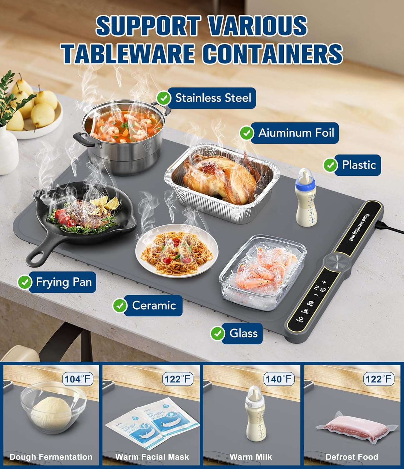 - 【Multi-functional food heating mat】The warming pads for food are indispensable companions in the kitchen. It not only keeps dishes warm during daily meals, but also helps to ferment dough, heat milk, defrost frozen food, etc. to meet your different needs.