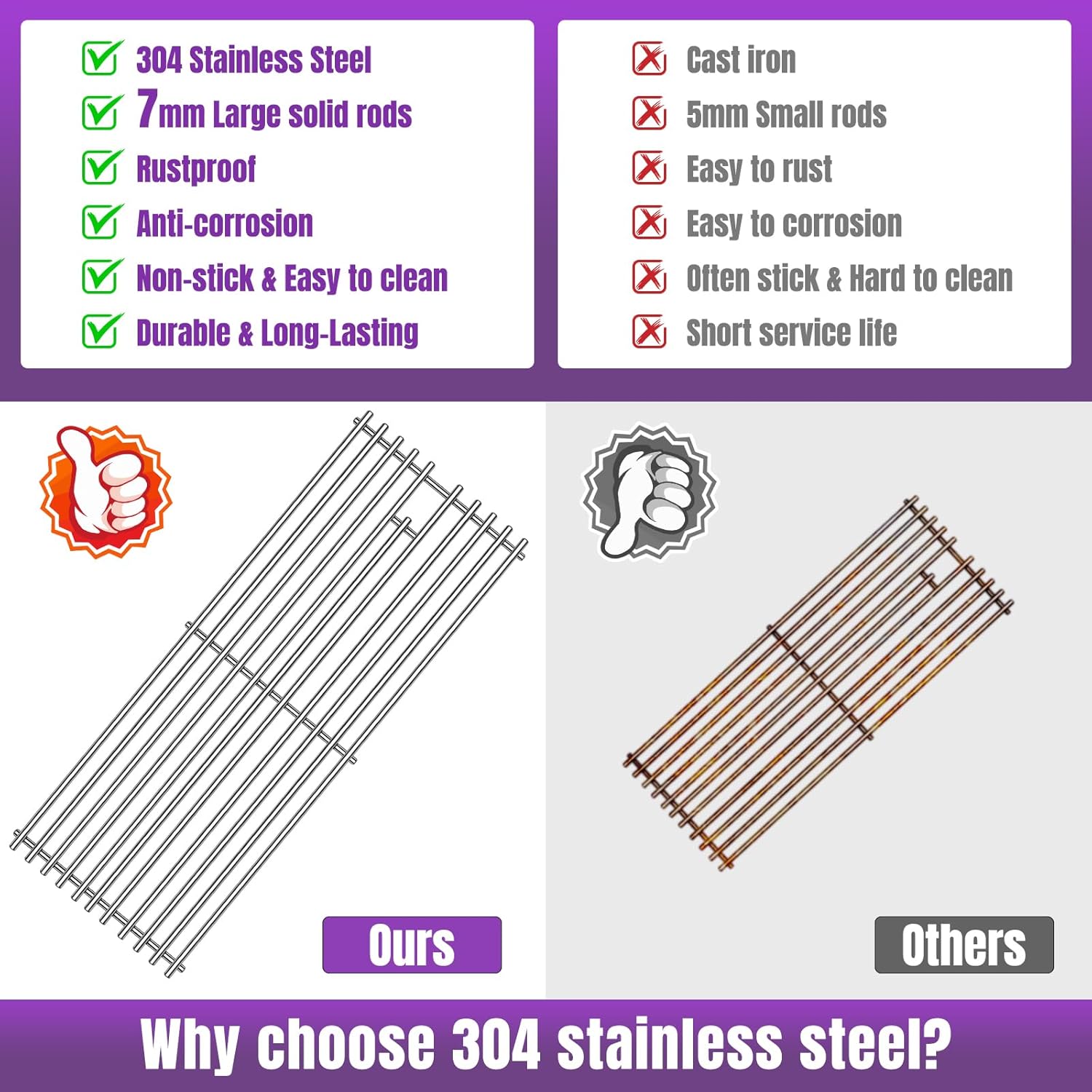 - Boloda High quality solid rods of stainless steel. These steels resist corrosion and maintain its strength at high temperatures. Thick is 7mm, More thicker and heavier than other brands, your barbecue grill won't wear out and rust after times of using.
